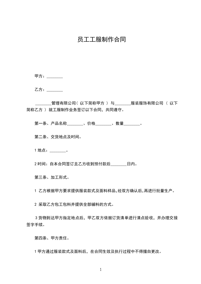 ________管理有限公司( 以下简称甲方 ) 与________服装服饰有限公司 ( 以下简称乙方 ) 就工服制作业务签订以下合同,共同遵守。