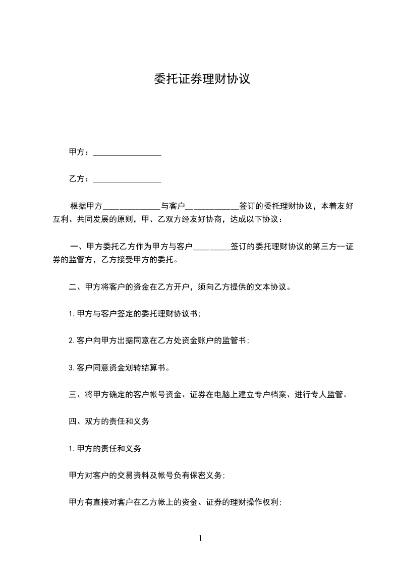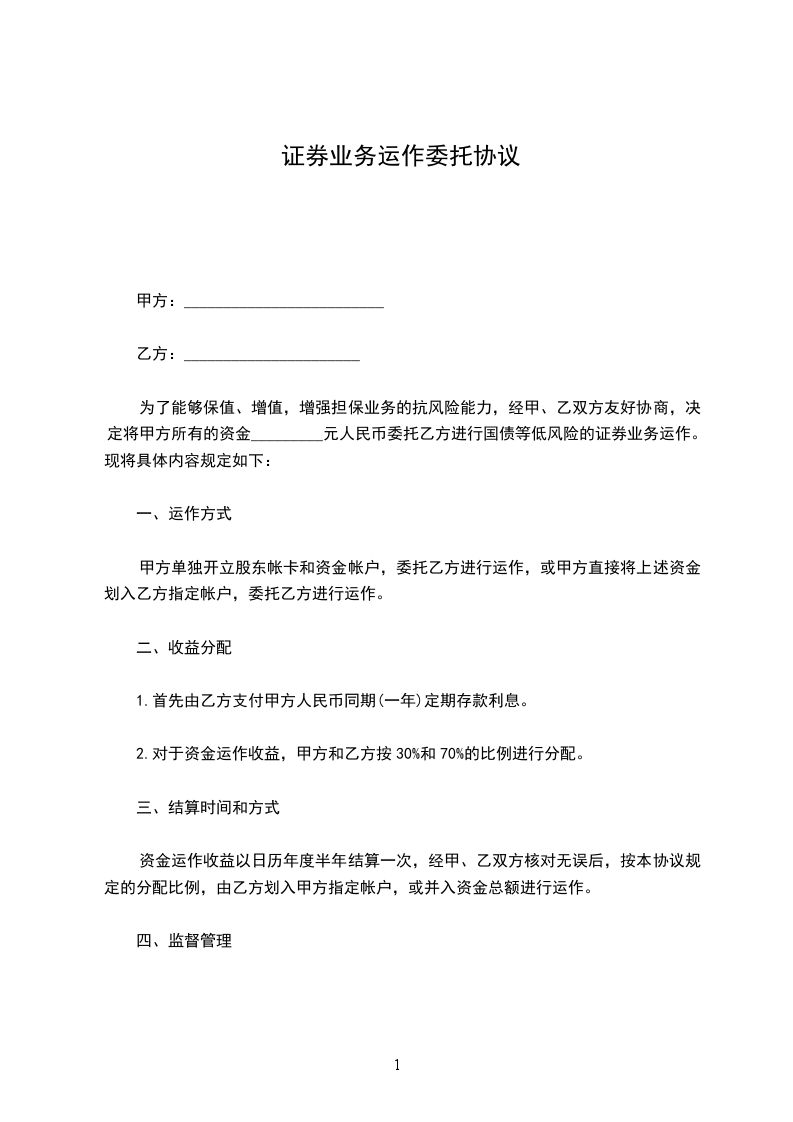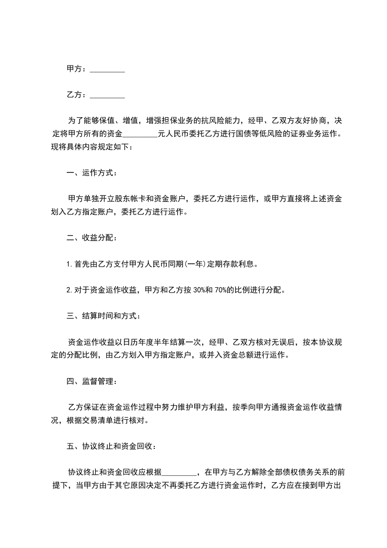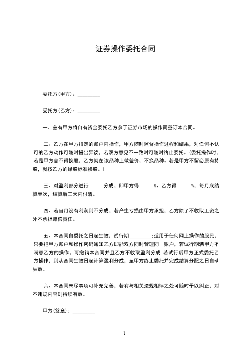 一、兹有甲方将自有资金委托乙方参于证券市场的操作而签订本合同。