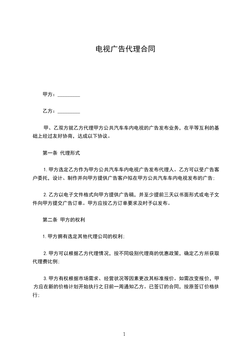 1.甲方选定乙方作为甲方公共汽车车内电视广告发布代理人。乙方可以受广告客户委托,设计、制作并向甲方提供广告客户拟在甲方公共汽车车内电视发布的广告;