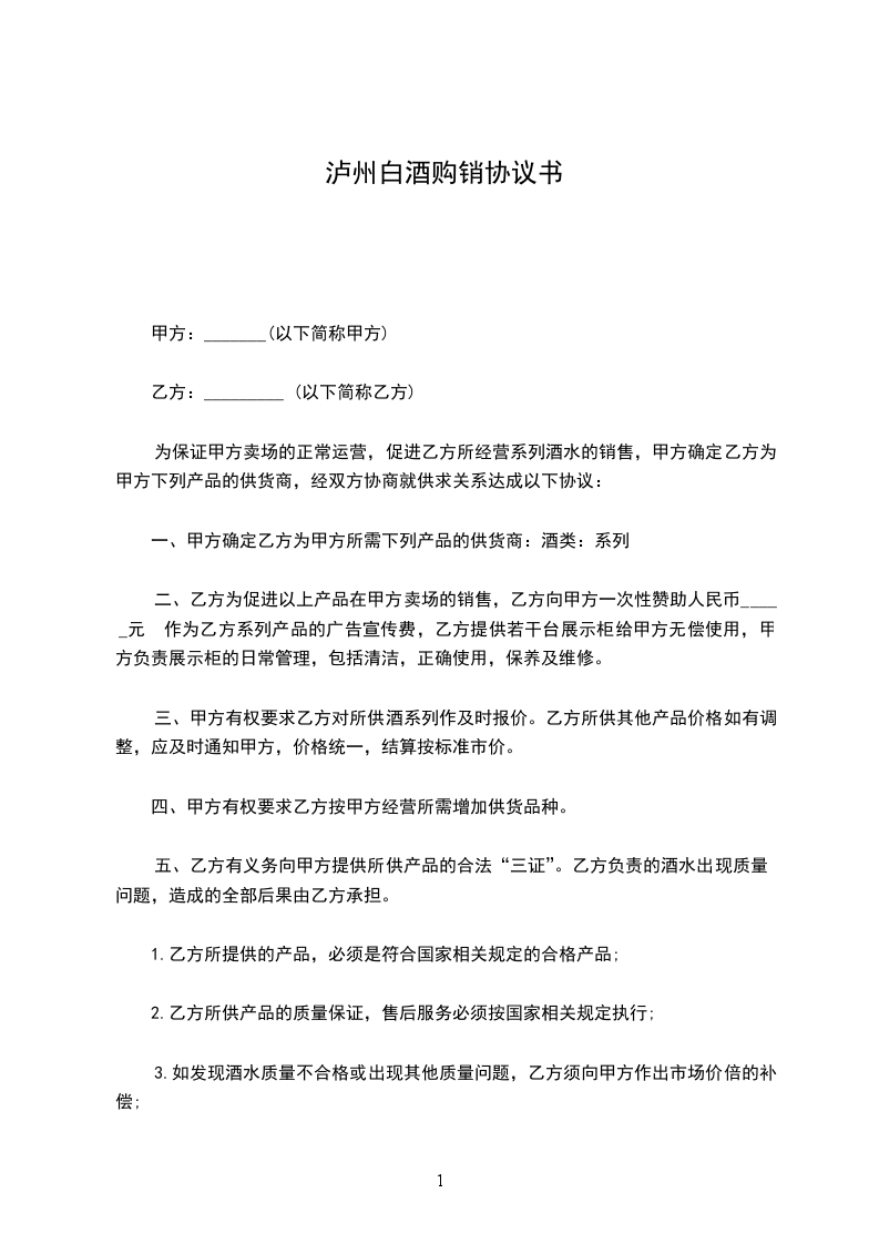 3.如发现酒水质量不合格或出现其他质量问题,乙方须向甲方作出市场价倍的补偿;