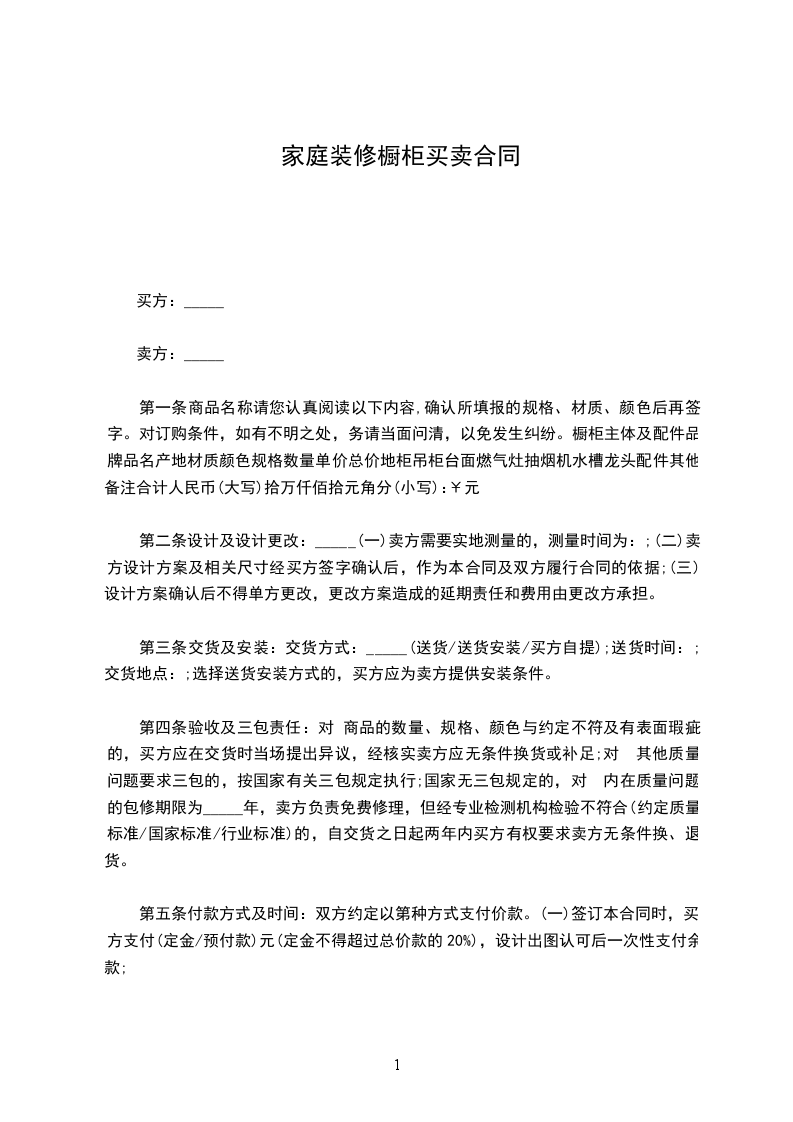 一、乙方根据甲方需求设计制作“__________”品牌厨柜,并根据甲方要求提供其它配套产品(详见______:《______橱柜订货清单》)。货款总额:人民币¥____________元(大写____________元)