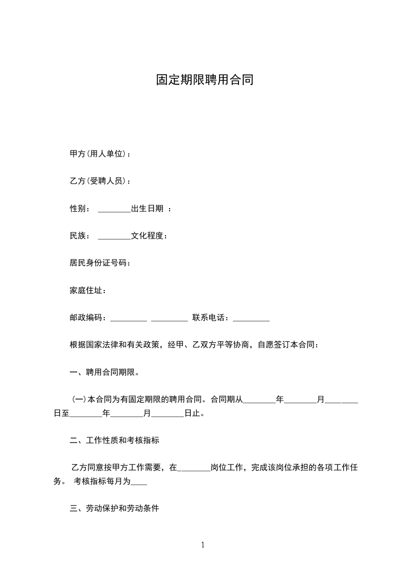(一)本合同为有固定期限的聘用合同。合同期从________年________月________日至________年________月________日止。