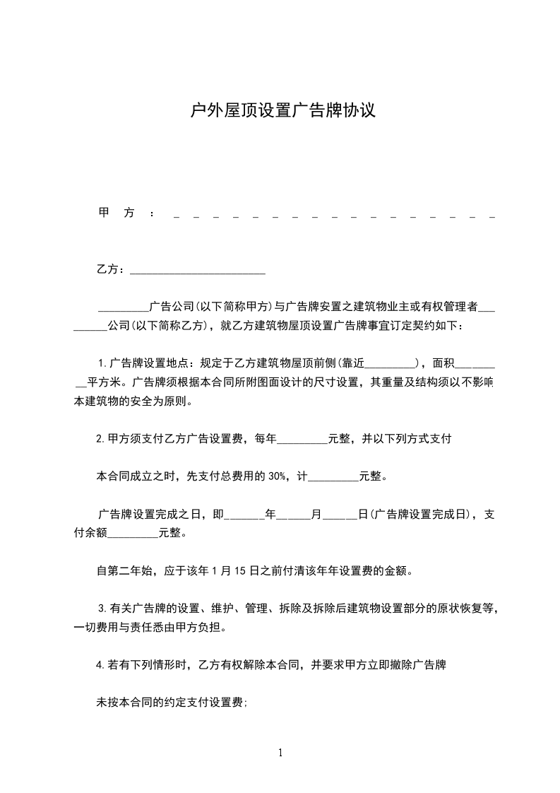 _________广告公司(以下简称甲方)与广告牌安置之建筑物业主或有权管理者_________公司(以下简称乙方),就乙方建筑物屋顶设置广告牌事宜订定契约如下: