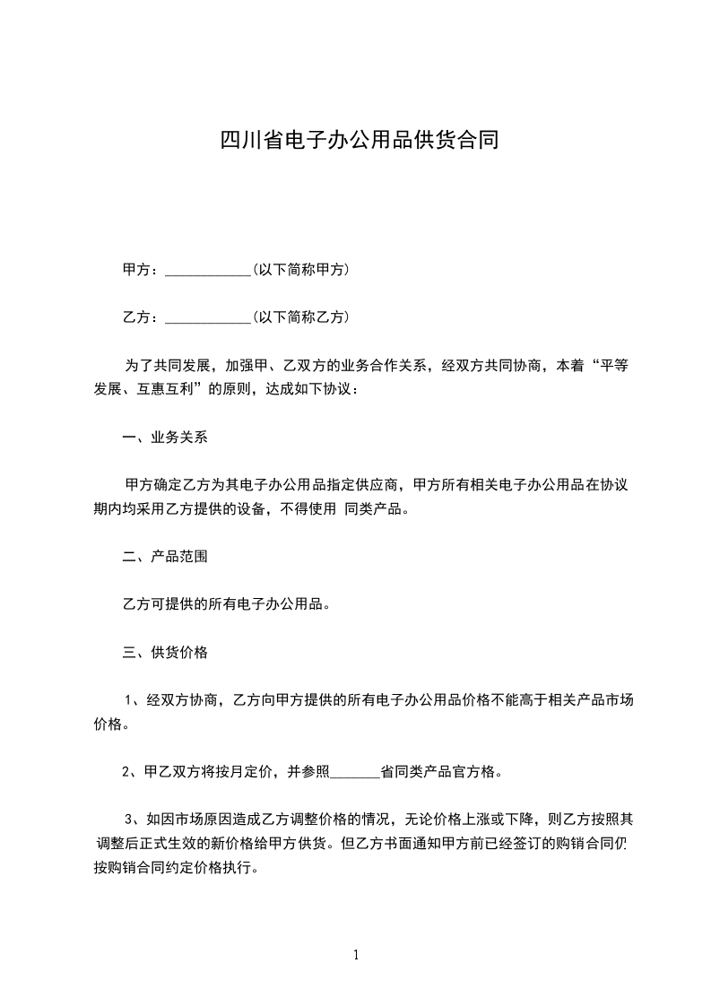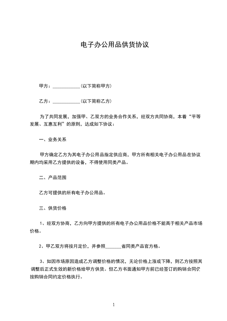 1、经双方协商,乙方向甲方提供的所有电子办公用品价格不能高于相关产品市场价格。