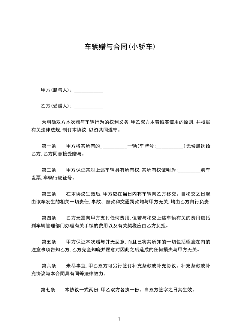 第一条 甲方将其所有的___________一辆(车牌号:___________)无偿赠送给乙方,乙方同意接受赠与。