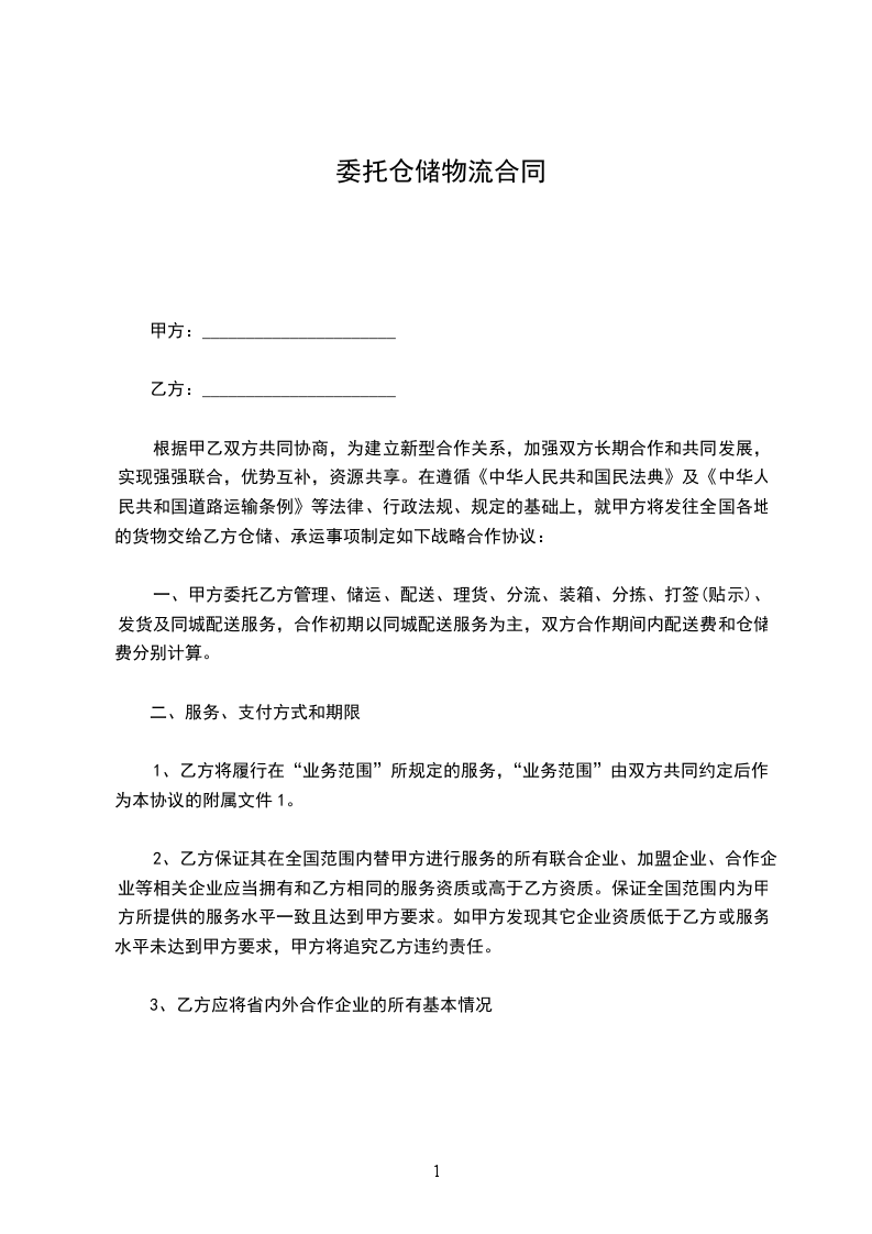 根据甲乙双方共同协商,为建立新型合作关系,加强双方长期合作和共同发展,实现强强联合,优势互补,资源共享。在遵循《中华人民共和国民法典》及《中华人民共和国道路运输条例》等法律、行政法规、规定的基础上,就甲方将发往全国各地的货物交给乙方仓储、承运事项制定如下战略合作协议: