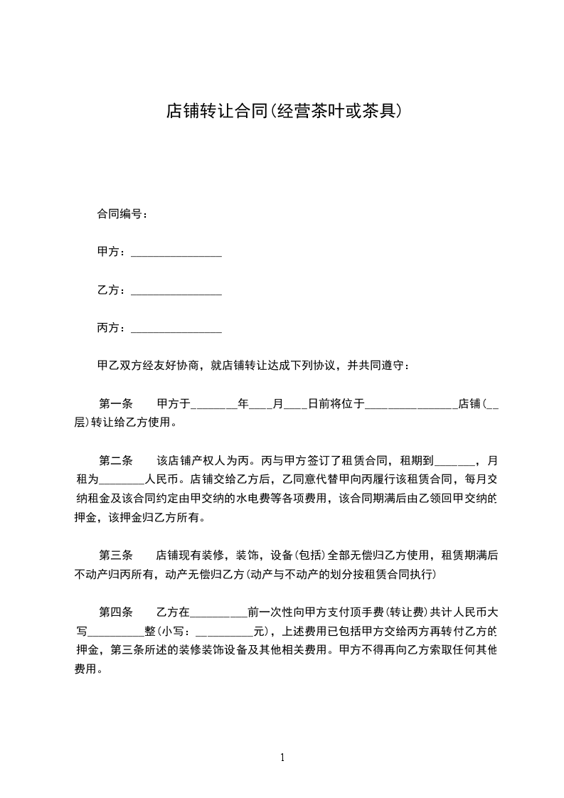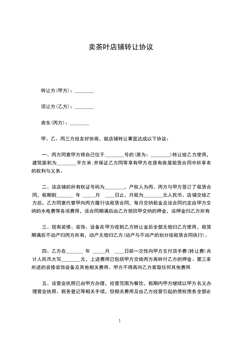 第一条甲方同意将位于______楼______号,转让给乙方使用,面积______平方米,转让金为人民币______整。注明:甲方于______年______月______日至______年______月______日租用店铺合同,空铺转让给乙方。