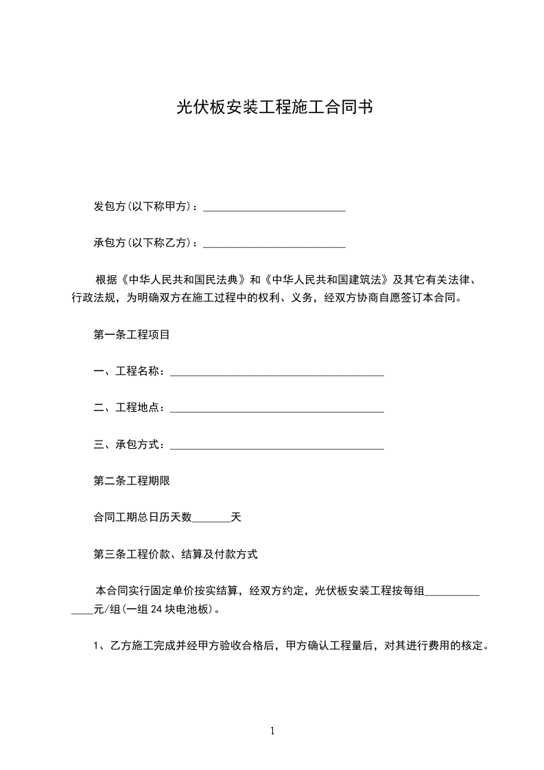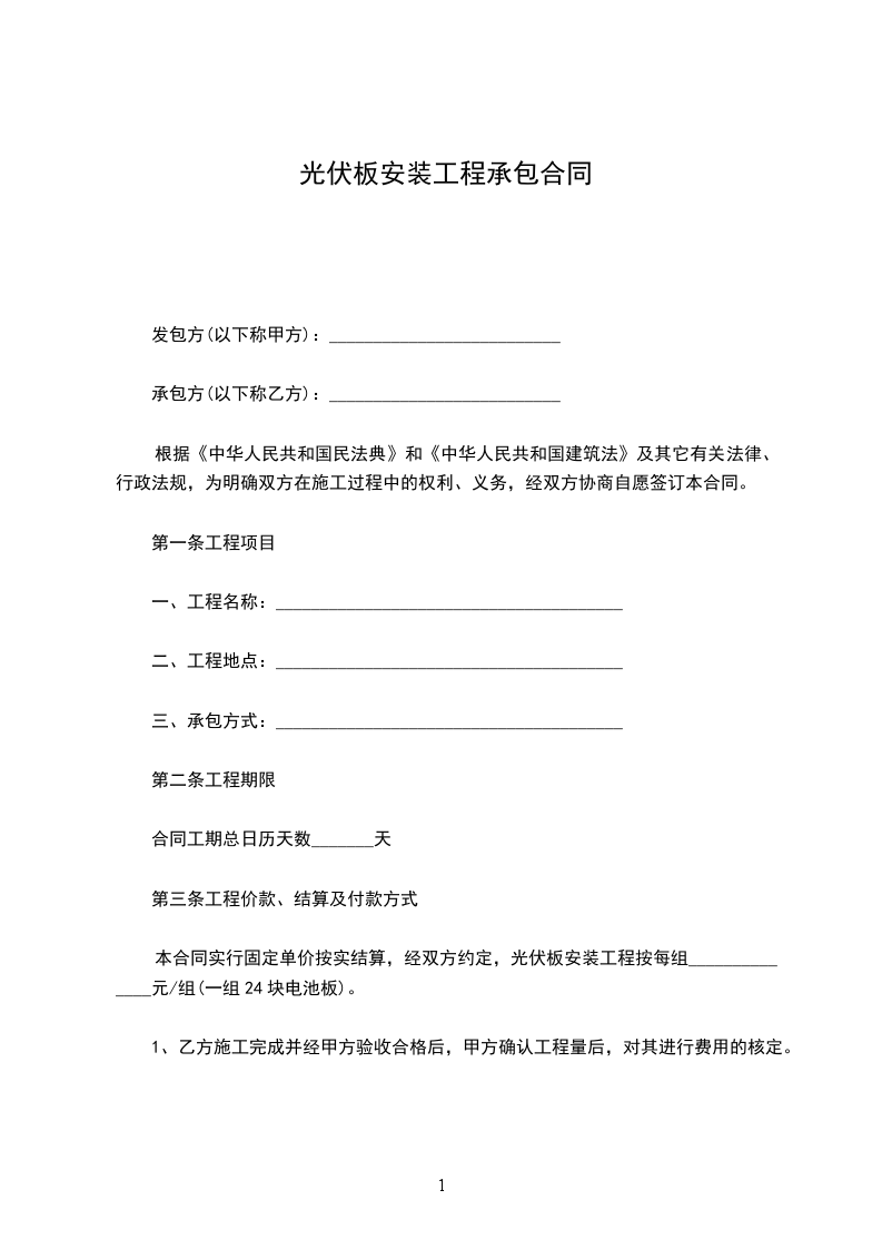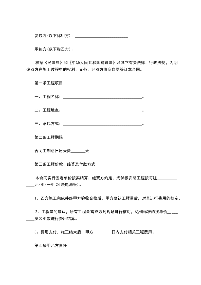 本合同实行固定单价按实结算,经双方约定,光伏板安装工程按每组______________元/组(一组24块电池板)。