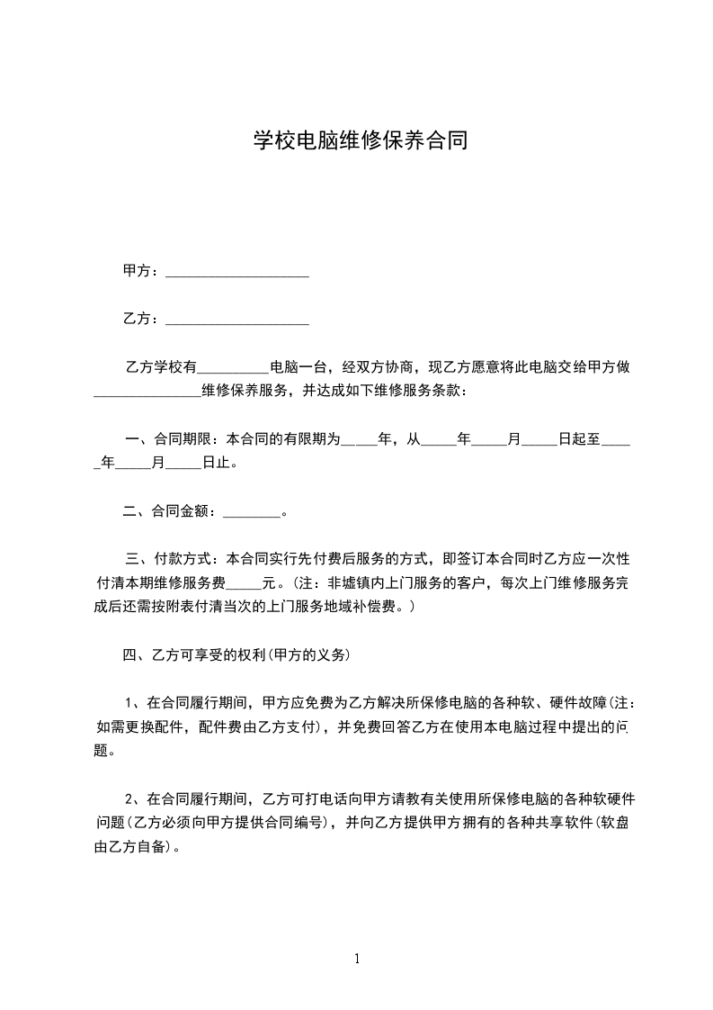 乙方学校有__________电脑一台,经双方协商,现乙方愿意将此电脑交给甲方做_______________维修保养服务,并达成如下维修服务条款: