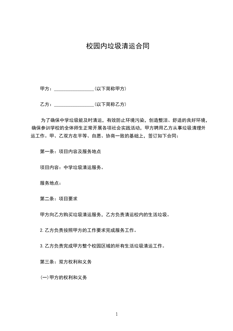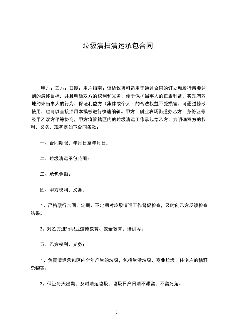 1、甲方把生产、生活垃圾承包给乙方清运,合同期限为__年,即:_________年________月________日至__________年_________月________日。