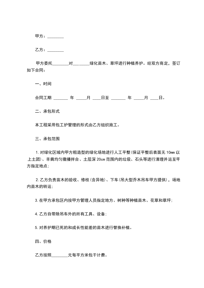 甲方委托________对________绿化苗木、草坪进行种植养护。经双方商定,签订如下合同: