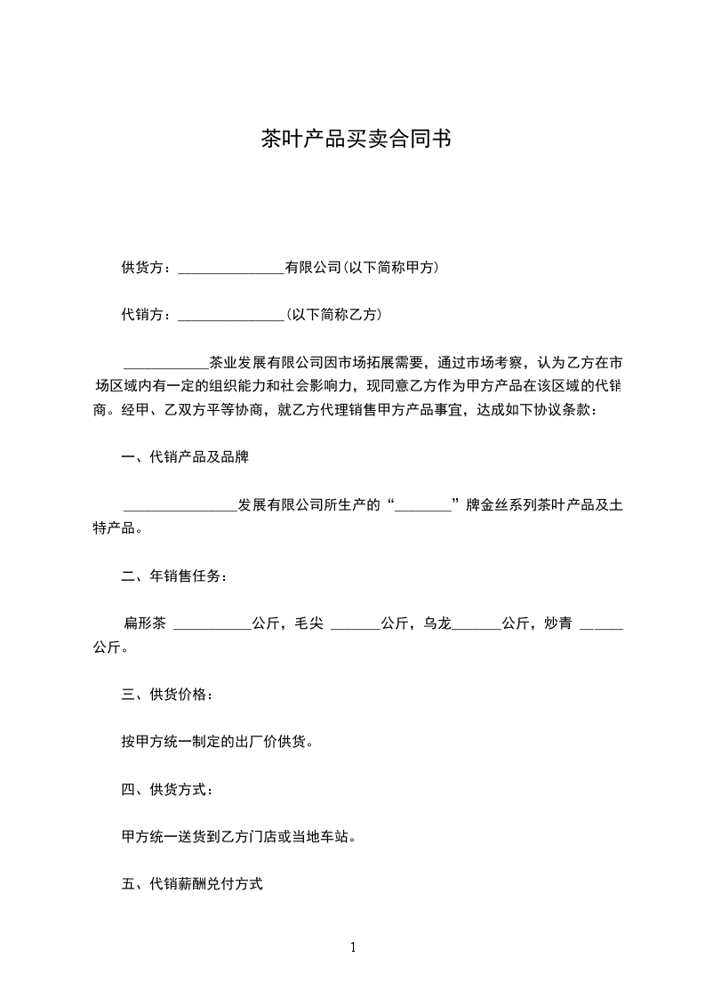 ____________茶业发展有限公司因市场拓展需要,通过市场考察,认为乙方在市场区域内有一定的组织能力和社会影响力,现同意乙方作为甲方产品在该区域的代销商。经甲、乙双方平等协商,就乙方代理销售甲方产品事宜,达成如下协议条款: