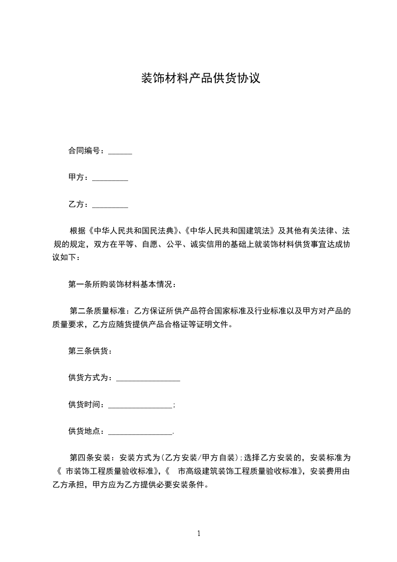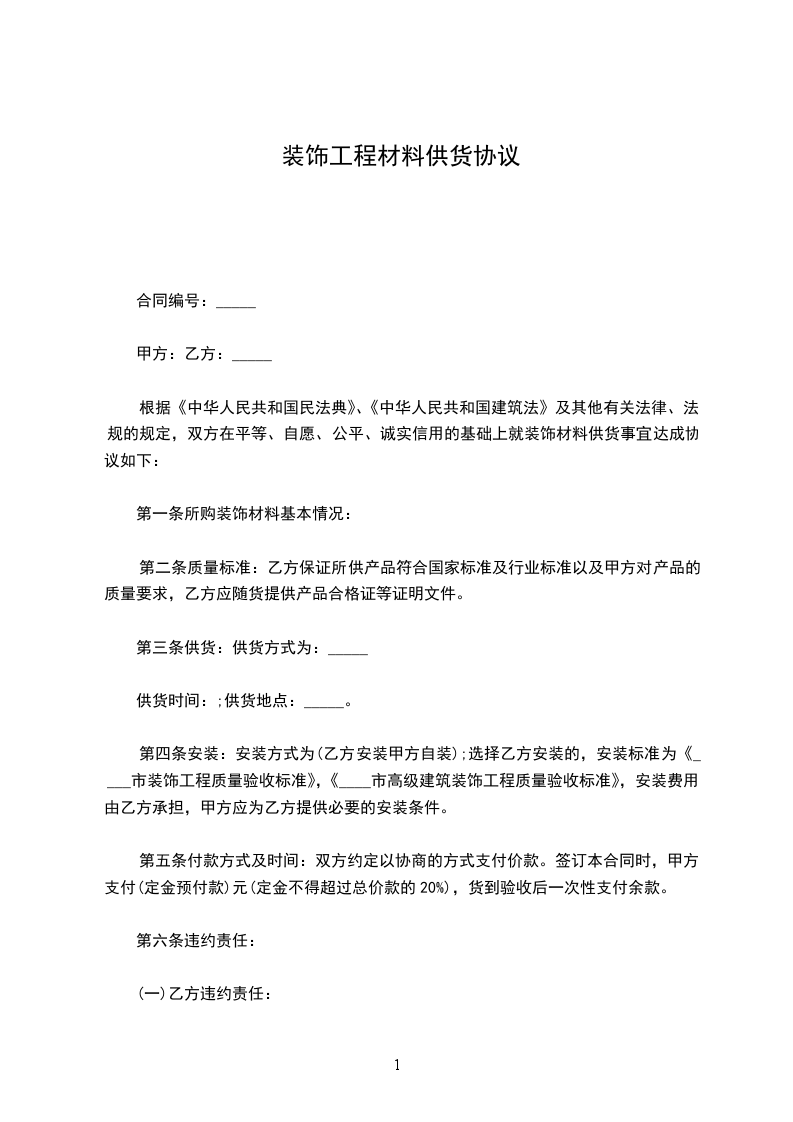 根据《中华人民共和国民法典》、《中华人民共和国建筑法》及其他有关法律、法规的规定,双方在平等、自愿、公平、诚实信用的基础上就装饰材料供货事宜达成协议如下: