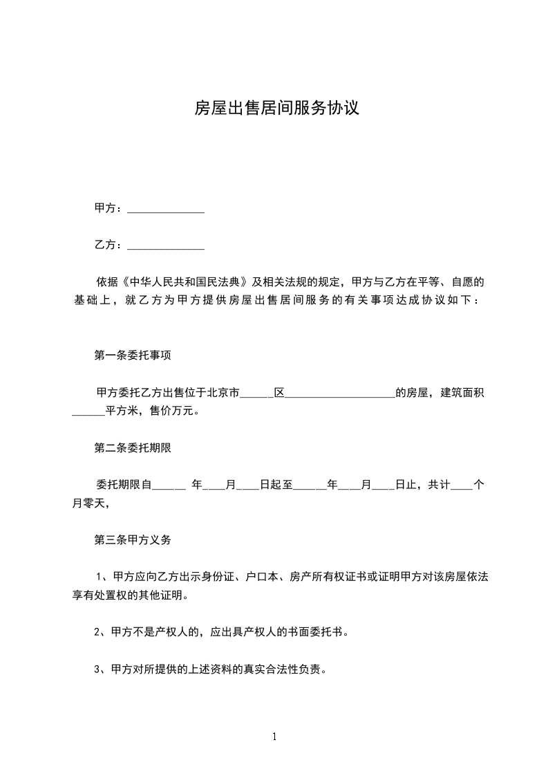 依据《中华人民共和国民法典》及相关法规的规定,甲方与乙方在平等、自愿的基础上,就乙方为甲方提供房屋出售居间服务的有关事项达成协议如下: