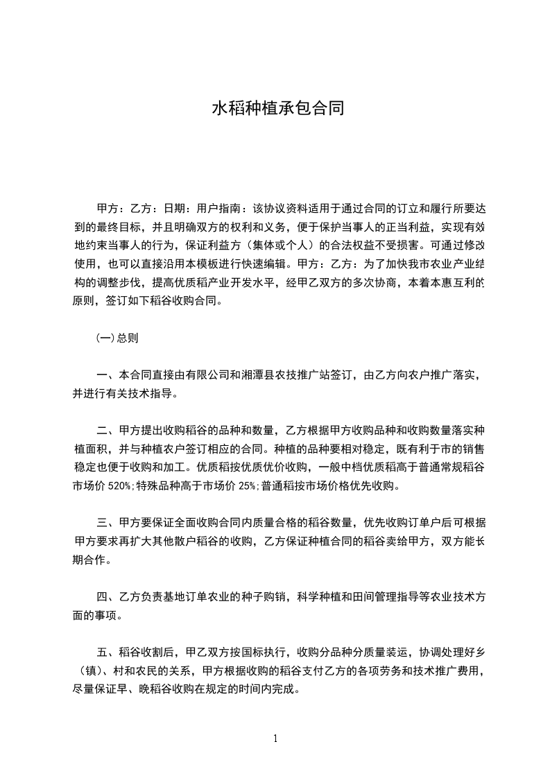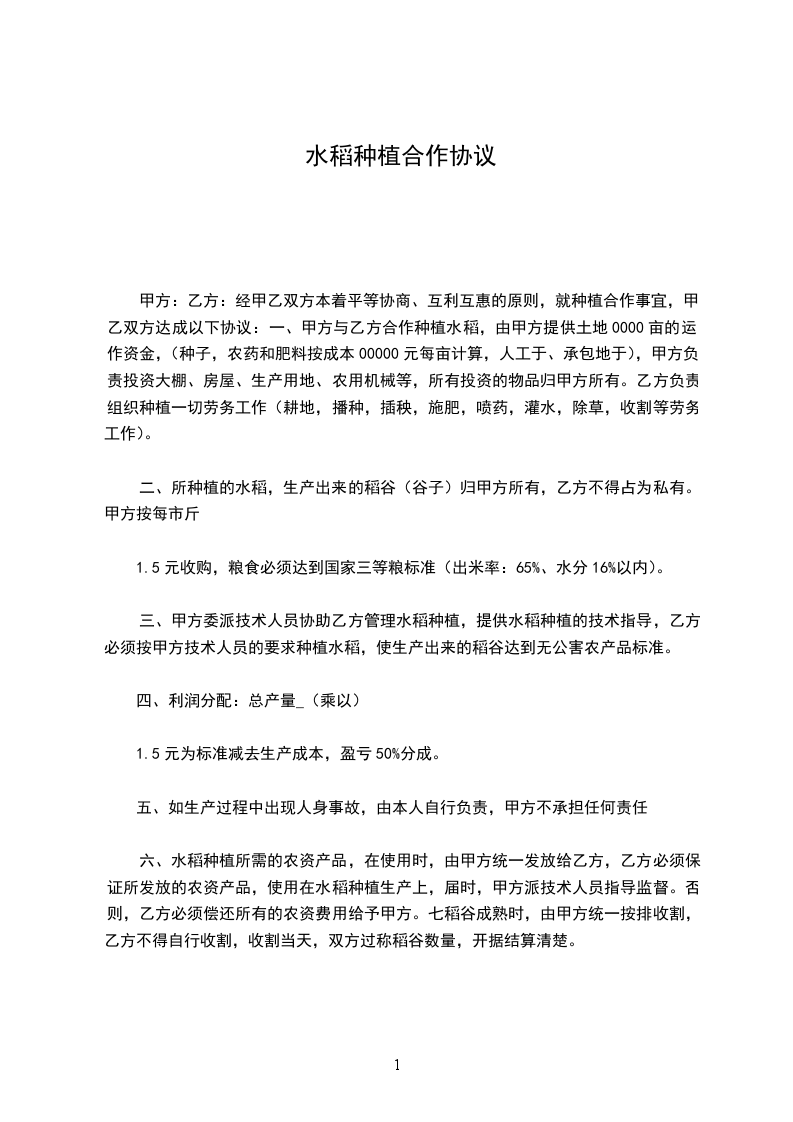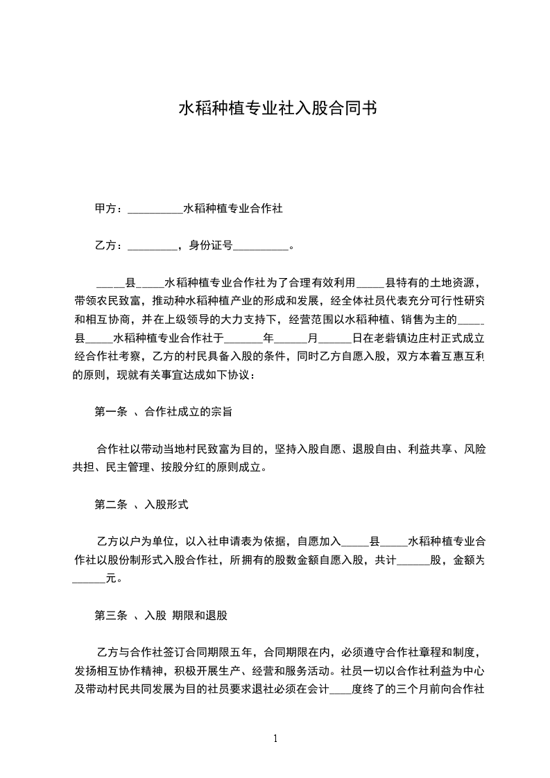 _____县_____水稻种植专业合作社为了合理有效利用_____县特有的土地资源,带领农民致富,推动种水稻种植产业的形成和发展,经全体社员代表充分可行性研究和相互协商,并在上级领导的大力支持下,经营范围以水稻种植、销售为主的_____县_____水稻种植专业合作社于_______年______月______日在老砦镇边庄村正式成立。经合作社考察,乙方的村民具备入股的条件,同时乙方自愿入股,双方本着互惠互利的原则,现就有关事宜达成如下协议: