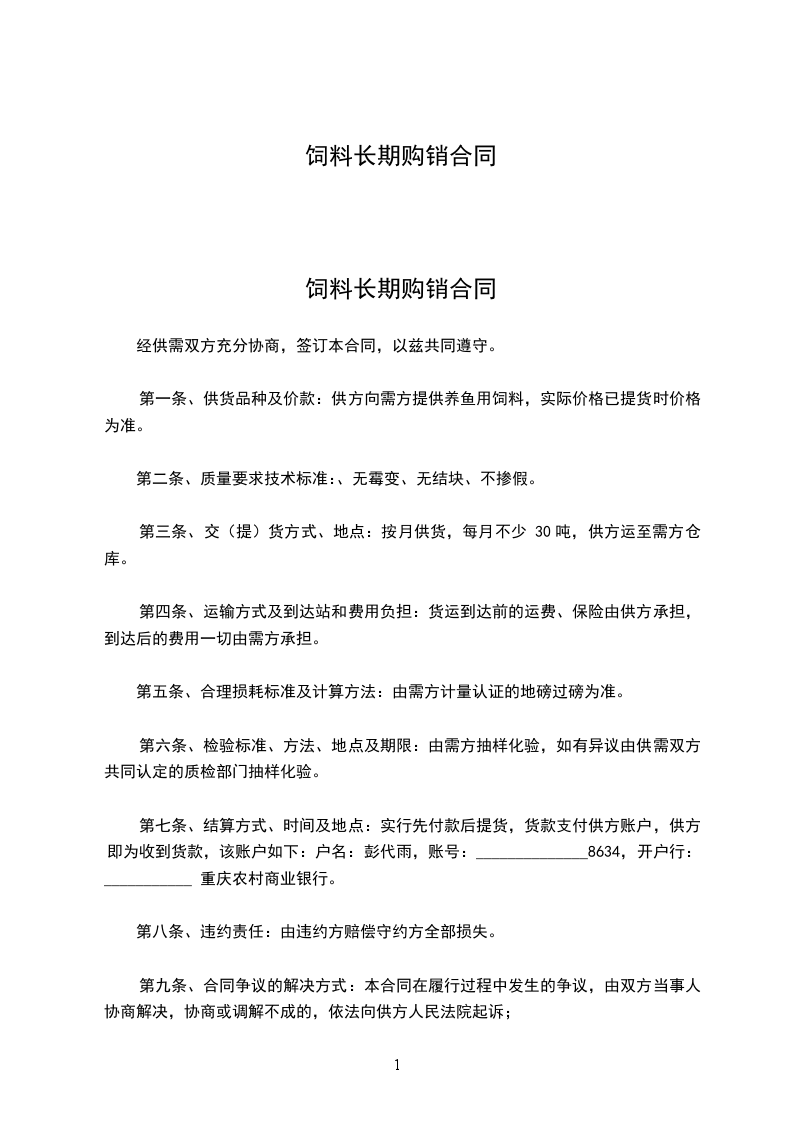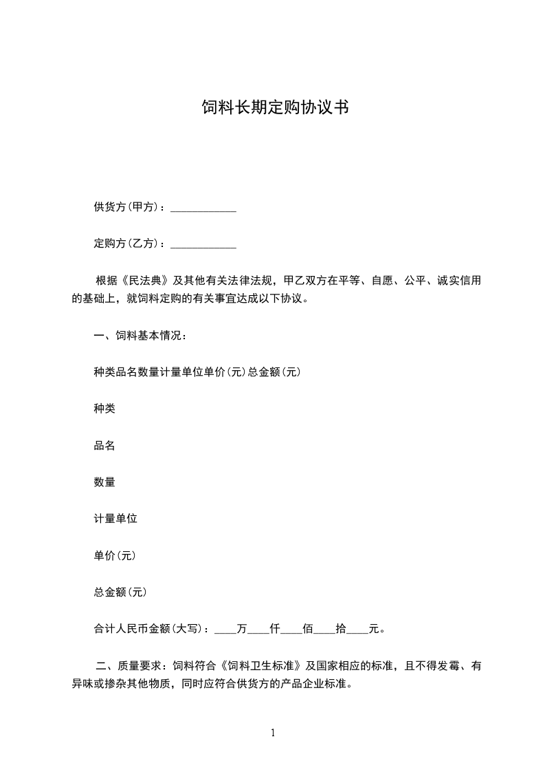 根据《中华人民共和国民法典》及其他有关法律法规,甲乙双方在平等、自愿、公平、诚实信用的基础上,就饲料定购的有关事宜达成以下协议。