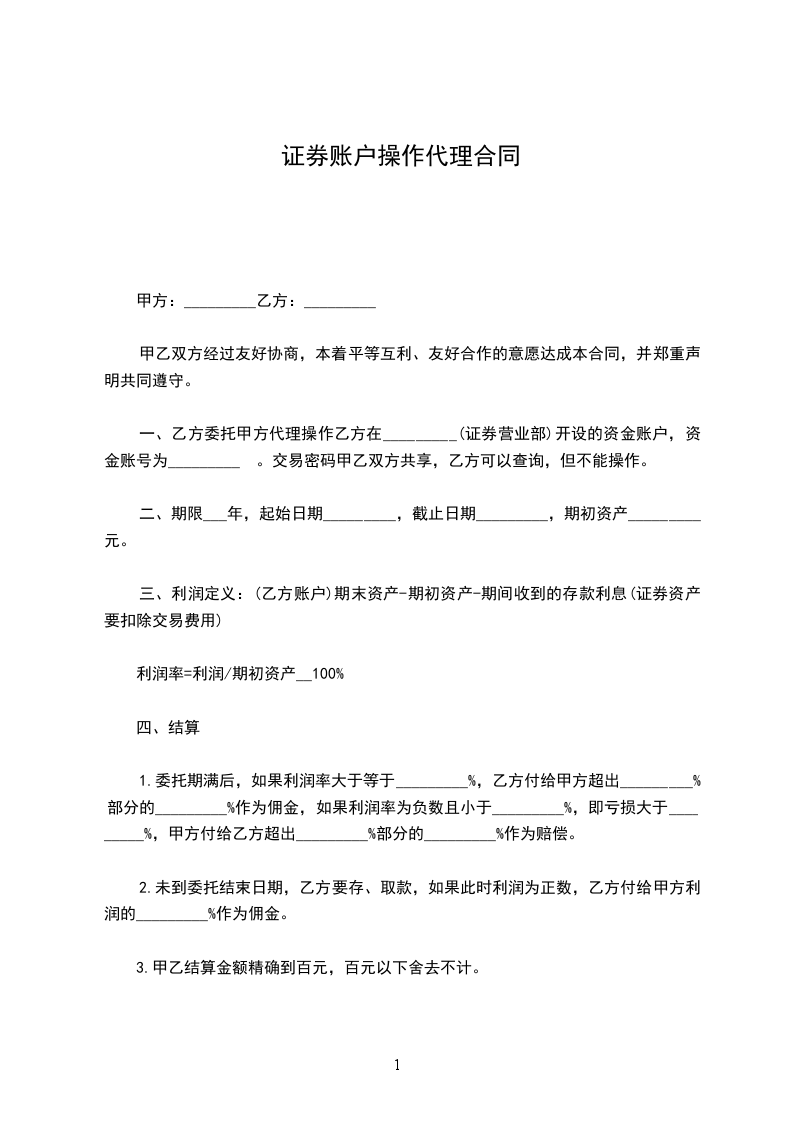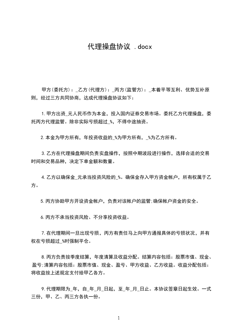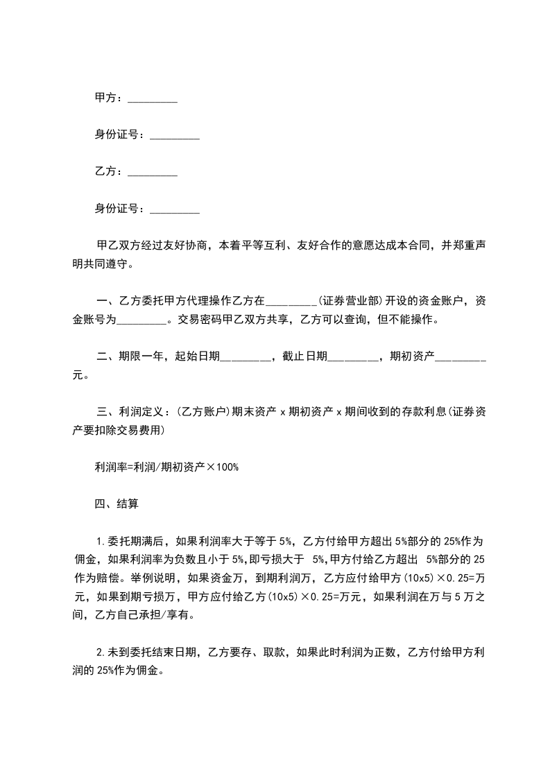 1.甲方出资_________元人民币作为本金,投入国内证券交易市场。委托乙方代理操盘,委托丙方代理监管。除非实际亏损超过10%,不得中途抽资。