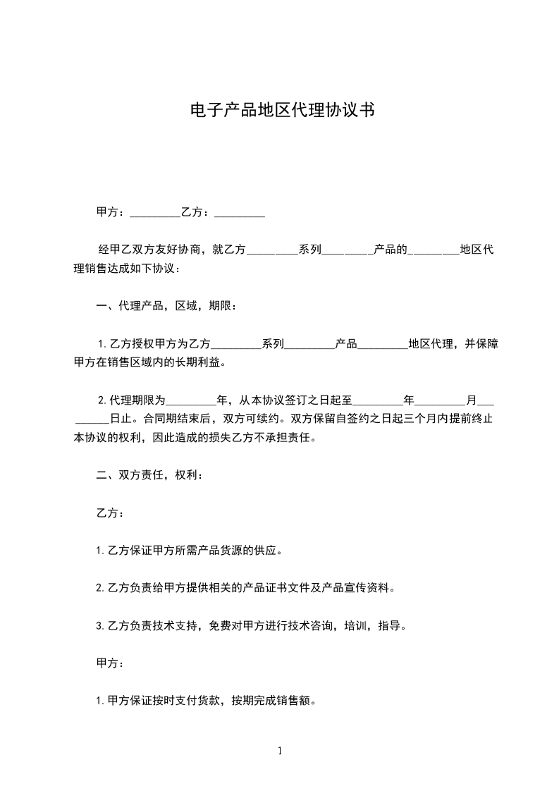 1、甲方授权乙方为甲方_____产品在__________地区内独家排他代理,并保障乙方在销售区域内的长期利益。具体区域指: