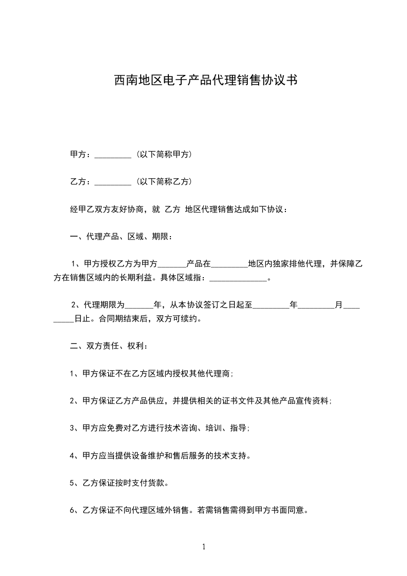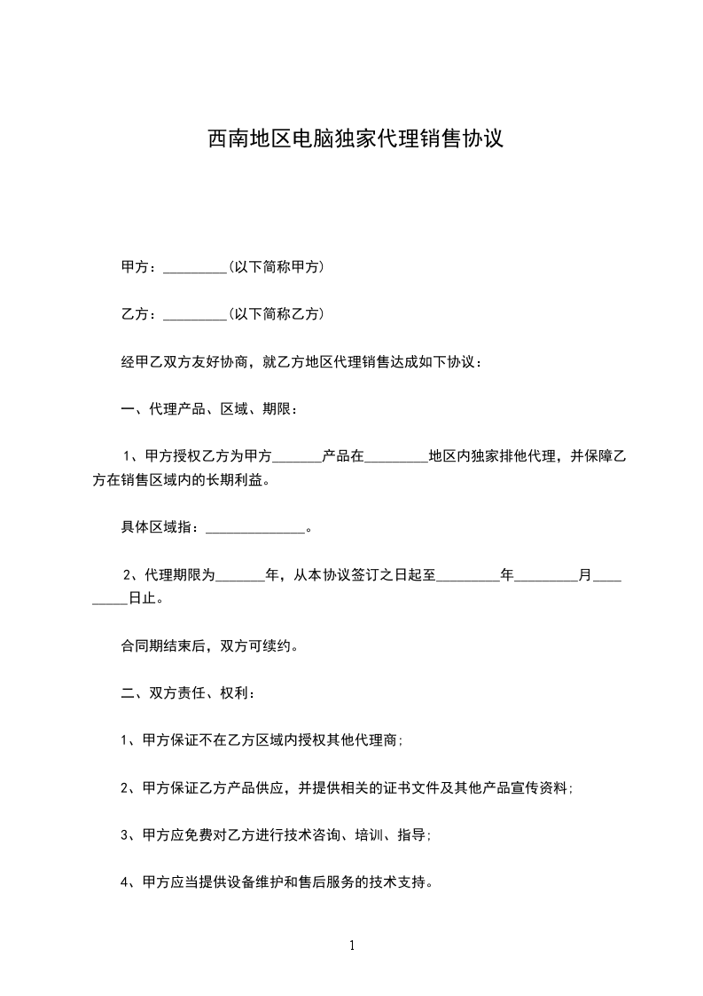 1、甲方保证不在乙方区域内授权其他代理商;