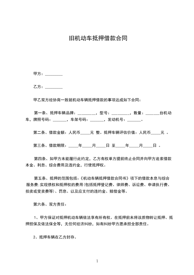 第一条、抵押车辆品牌:_________,型号:_________,数量:_______台机动车,牌照号码:_______,车架号码:_______,发动机号:_______。