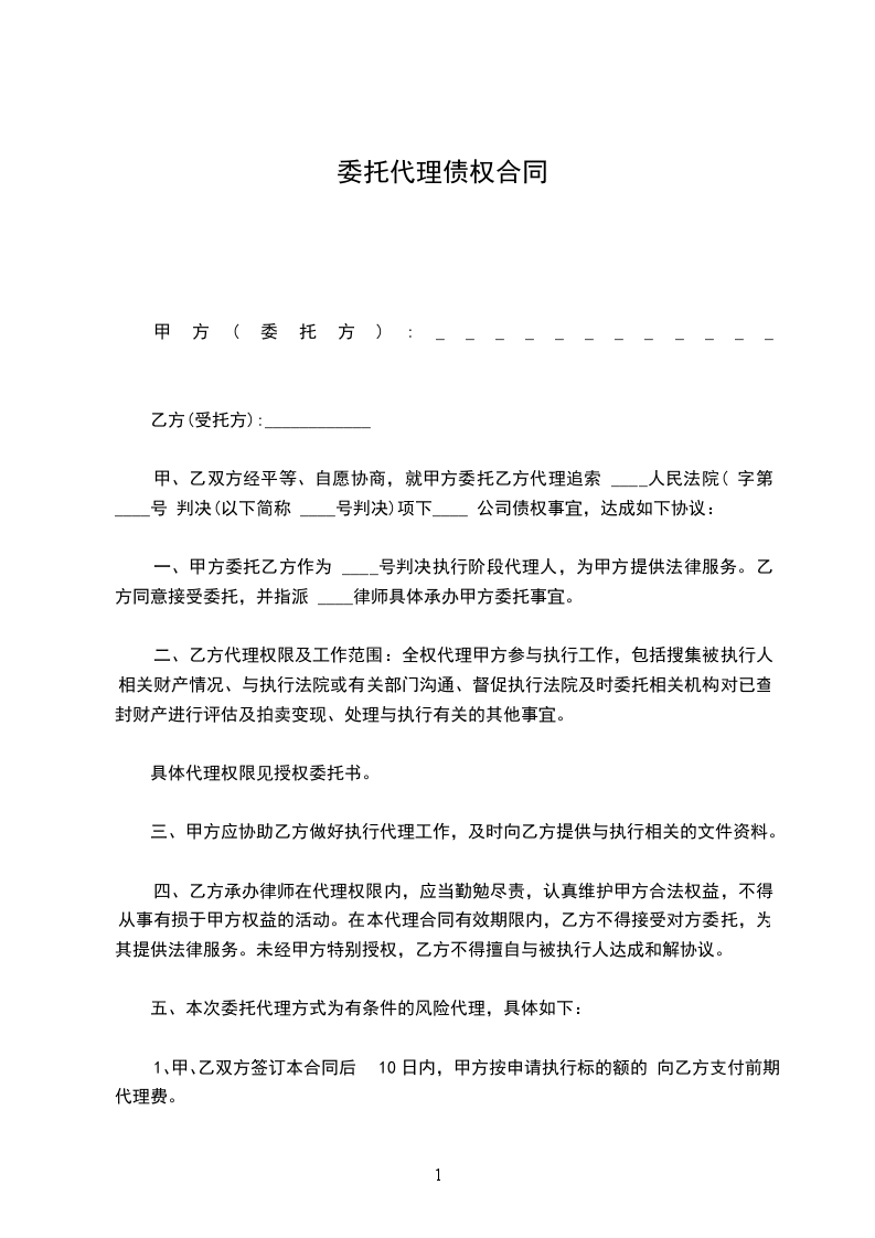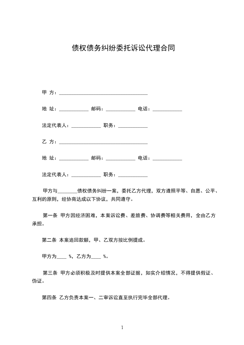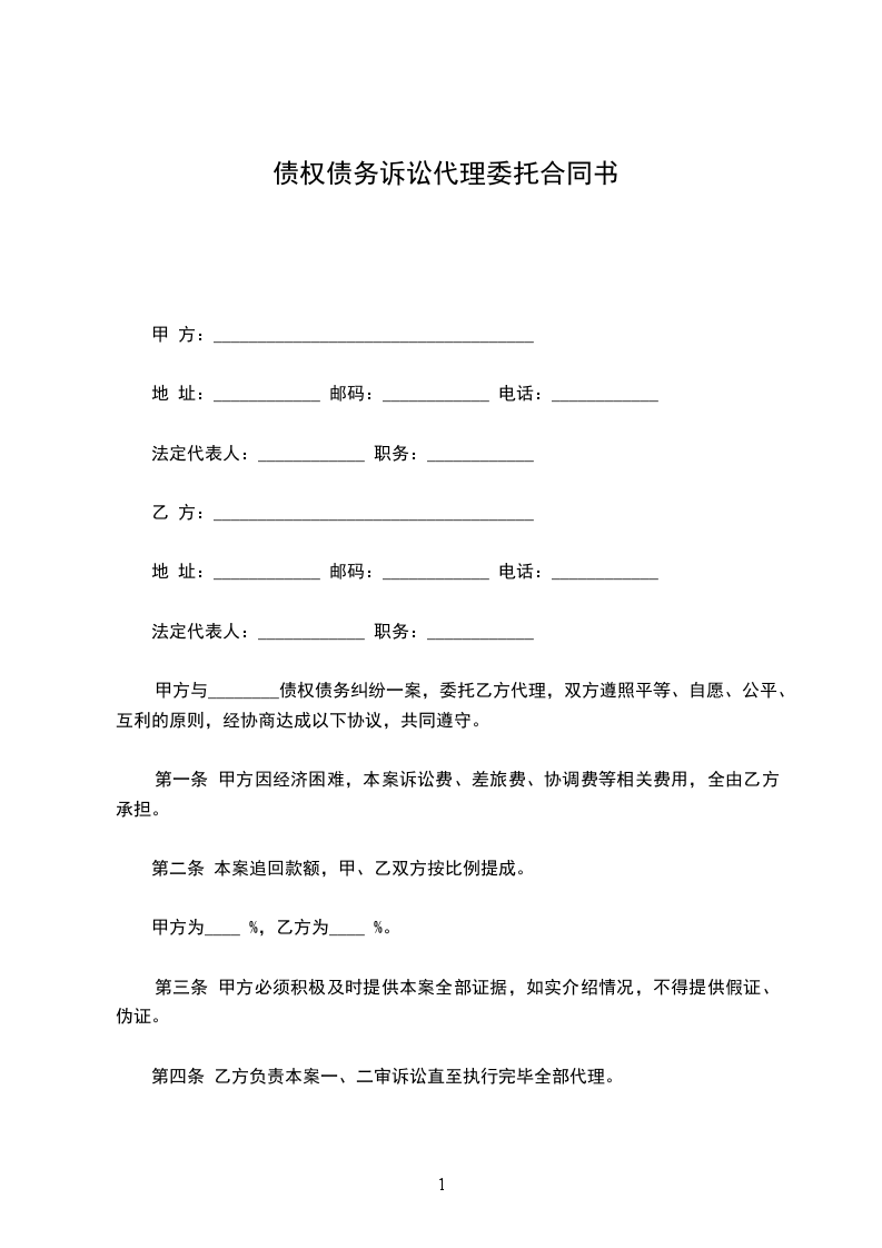 甲方与________债权债务纠纷一案,委托乙方代理,双方遵照平等、自愿、公平、互利的原则,经协商达成以下协议,共同遵守。