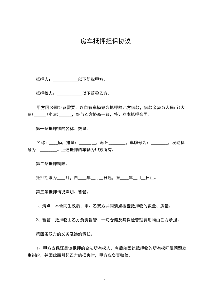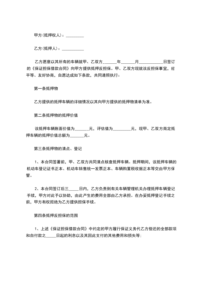 甲方因公司经营需要,以自有车辆做为抵押向乙方借款,借款金额为人民币(大写)______(小写)______,经与乙方协商一致,特订立本抵押合同。