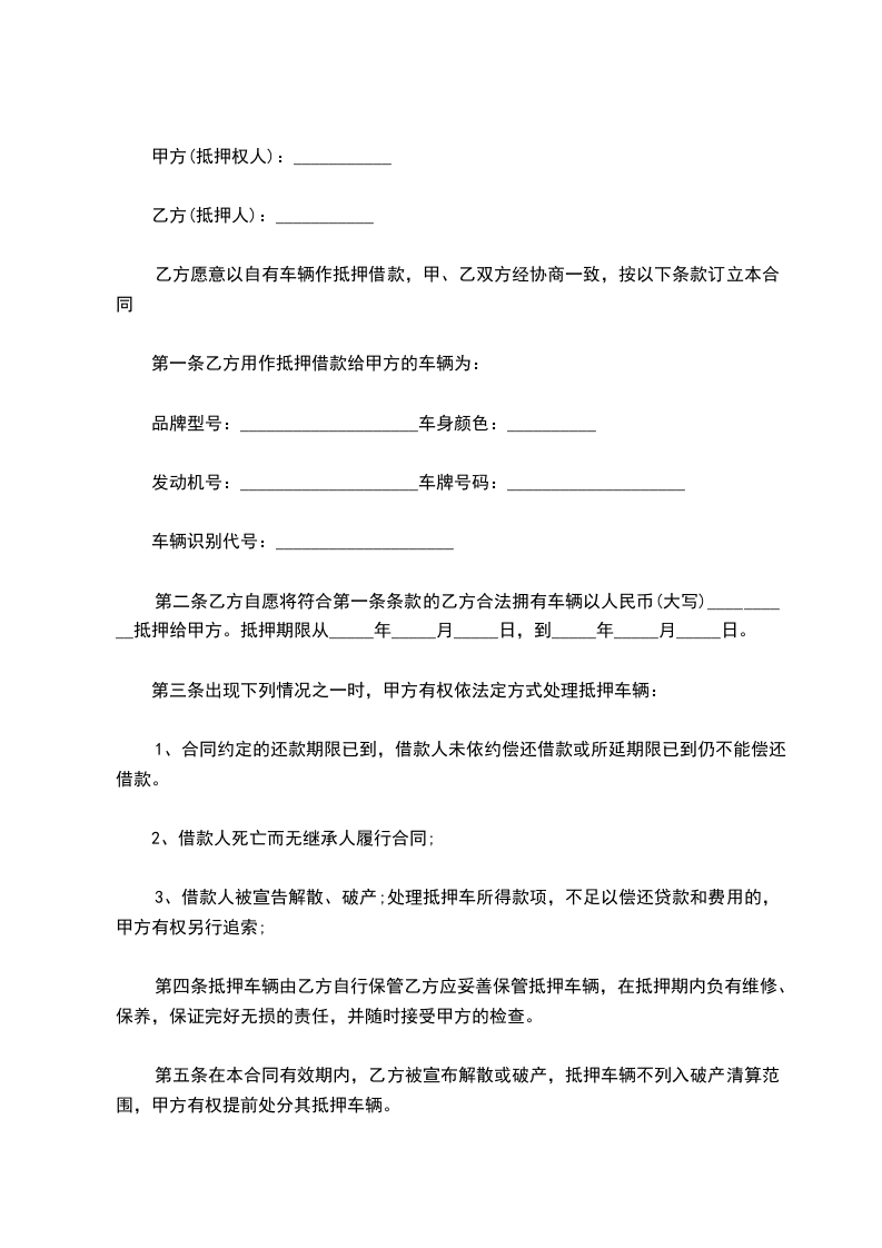 名称:____辆,排量:________,颜色________,车牌号为:________,发动机号为:________。上述抵押的车辆为甲方所有。