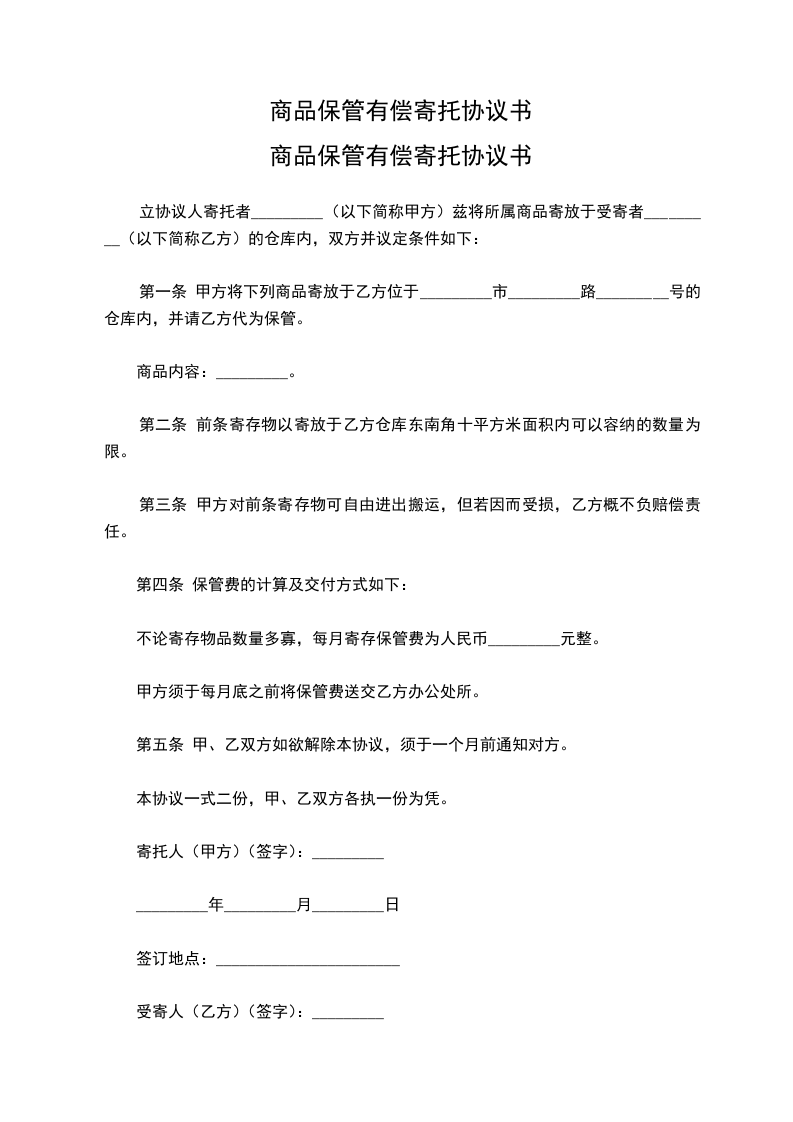 第一条 甲方将下列商品寄放于乙方位于_________市_________路_________号的仓库内,并请乙方代为保管。
