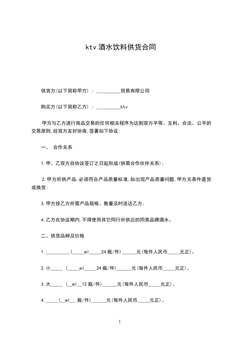 1.__________(_____ml_____24瓶/件)______元(每件人民币_____元正)。