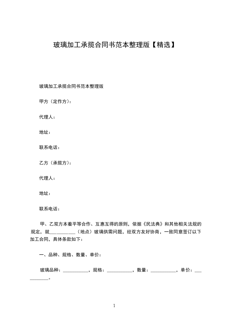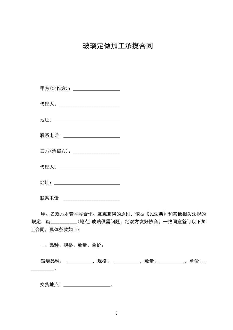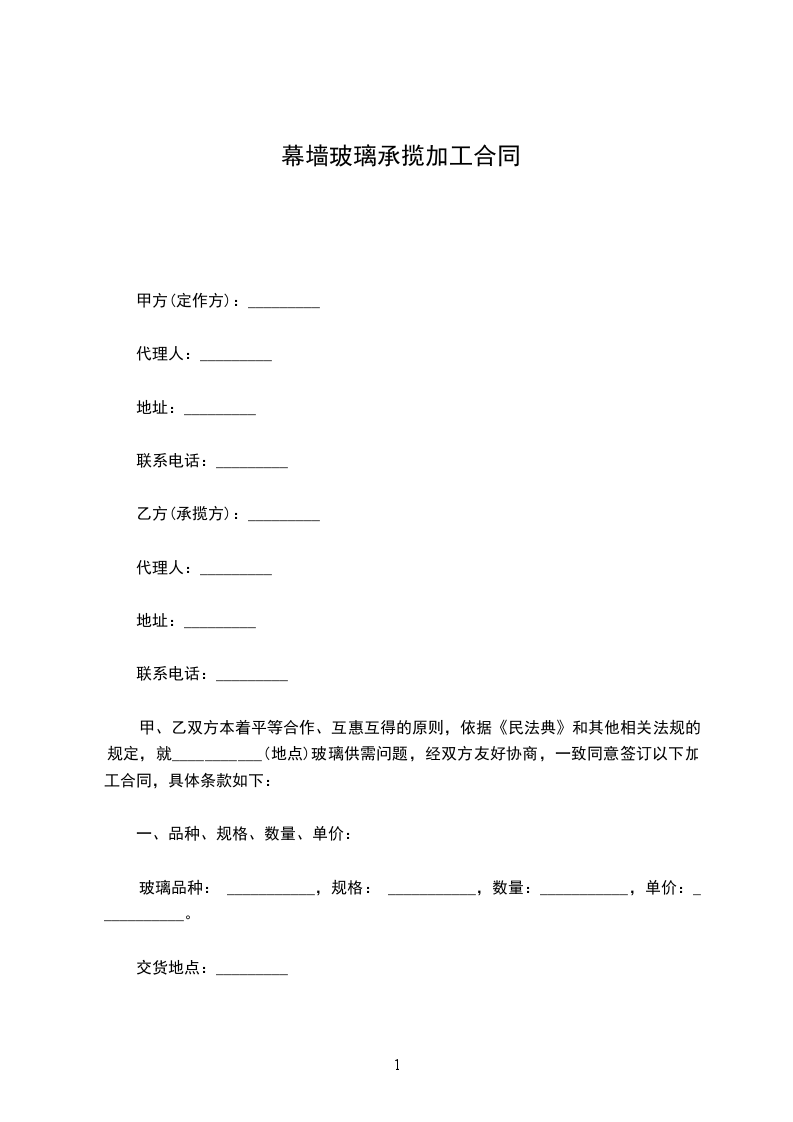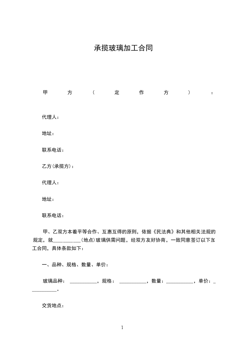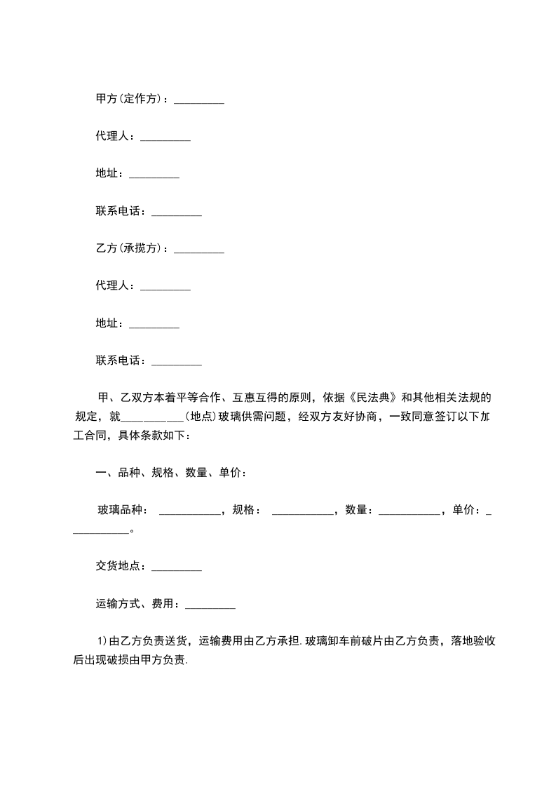 甲、乙双方本着平等合作、互惠互得的原则,依据《民法典》和其他相关法规的规定,就___________(地点)玻璃供需问题,经双方友好协商,一致同意签订以下加工合同,具体条款如下: