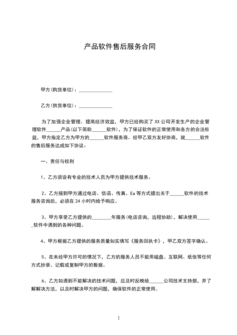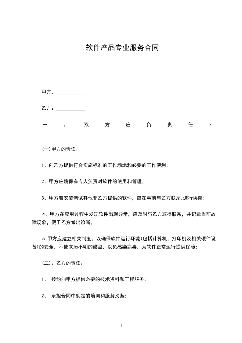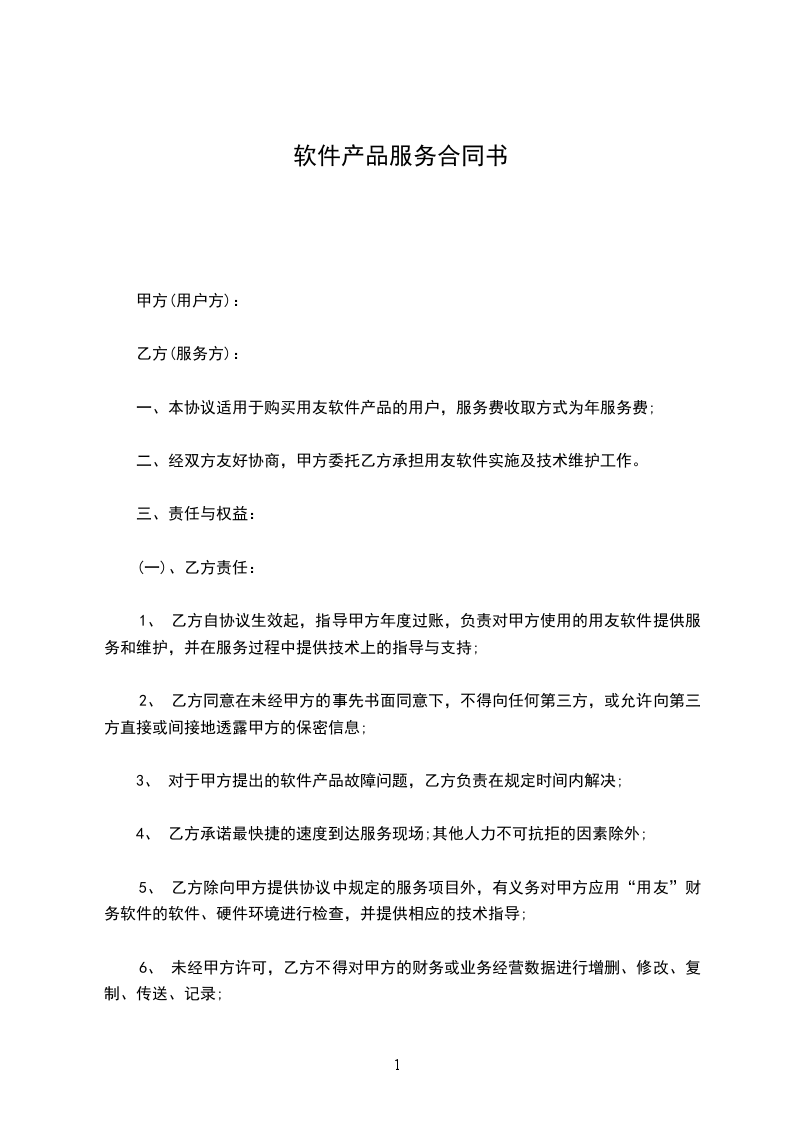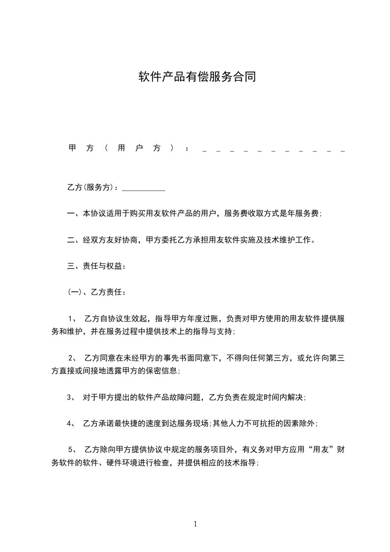 1、 乙方自协议生效起,指导甲方年度过账,负责对甲方使用的用友软件提供服务和维护,并在服务过程中提供技术上的指导与支持;