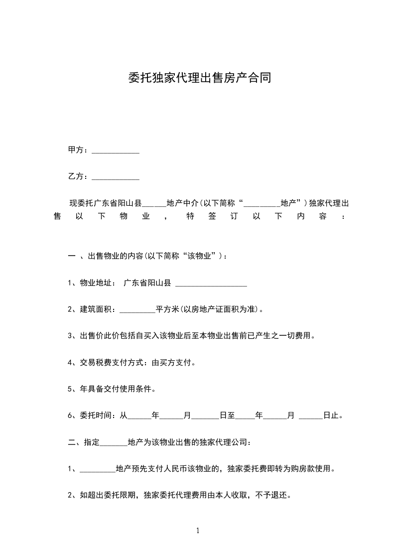 现委托广东省阳山县______地产中介(以下简称“_________地产”)独家代理出售以下物业,特签订以下内容: