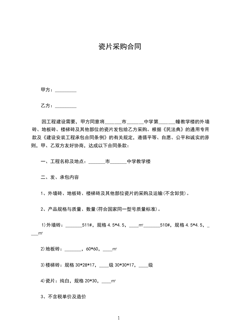 因工程建设需要,甲方同意将_______市_______中学第_______幢教学楼的外墙砖、地板砖、楼梯砖及其他部位的瓷片发包给乙方采购。根据《民法典》的通用专用款及《建设安装工程承包合同条例》的有关规定,遵循平等、自愿、公平和诚实的原则,甲、乙双方友好协商,达成以下合同条款: