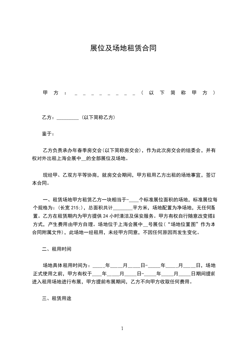 一、租赁场地甲方租赁乙方一块相当于-____个标准展位面积的场地,标准展位每个规格为:(长宽215;),总面积共计________平方米,场地配置为净场地,无任何配置。乙方在租赁期内为甲方提供24小时清洁及保安服务。甲方有权自行随意改变搭建方式,产生费用由甲方自理。场地位于上海会展中__号展位(“场地位置图”作为本合同附属文件),此场地一经租用,未经甲方同意,不因任何原因而发生变化。