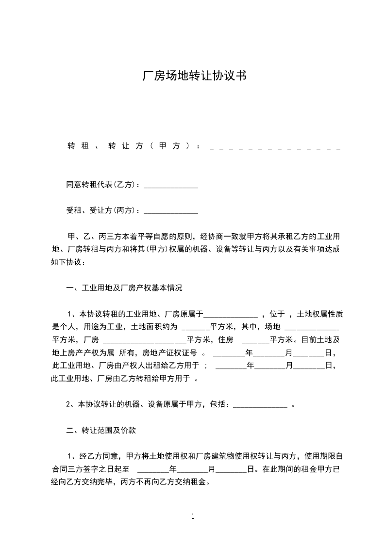 1、经乙方同意,甲方将土地使用权和厂房建筑物使用权转让与丙方,使用期限自合同三方签字之日起至 ________年________月________日。在此期间的租金甲方已经向乙方交纳完毕,丙方不再向乙方交纳租金。