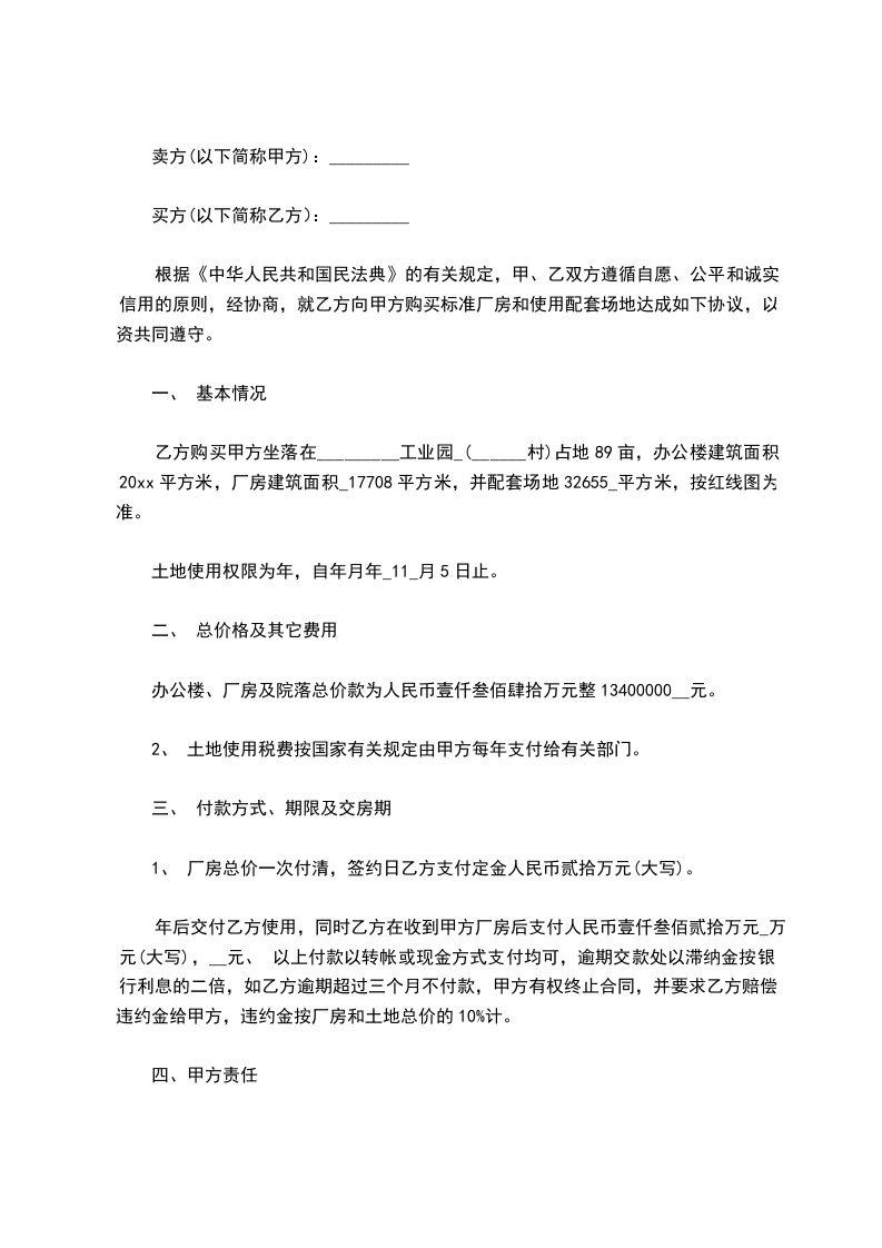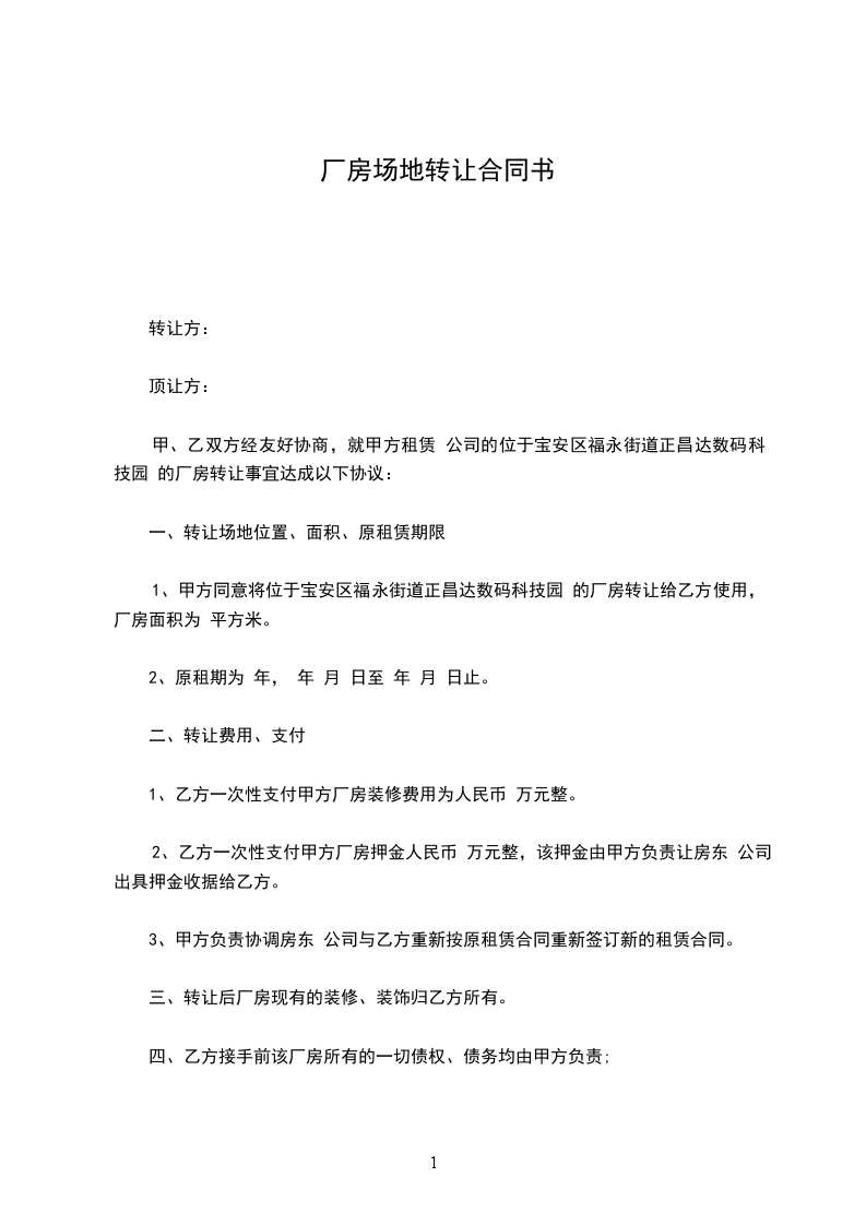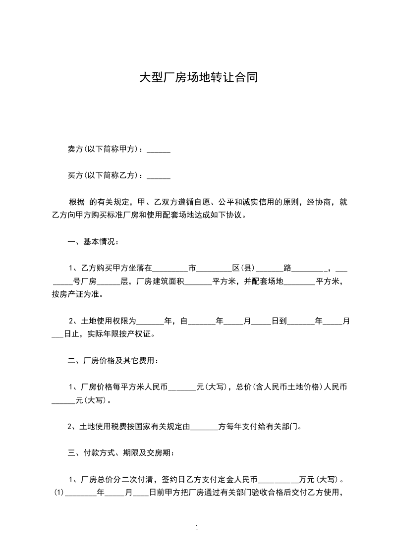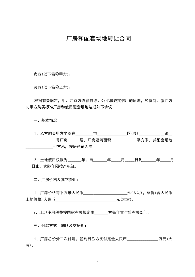 1、本转让合同书经甲、乙、丙三方签定后,丙方应首付甲方人民币_______ 元整,余款待丙方收到土地及厂房使用权证之日一次性向甲方结清。