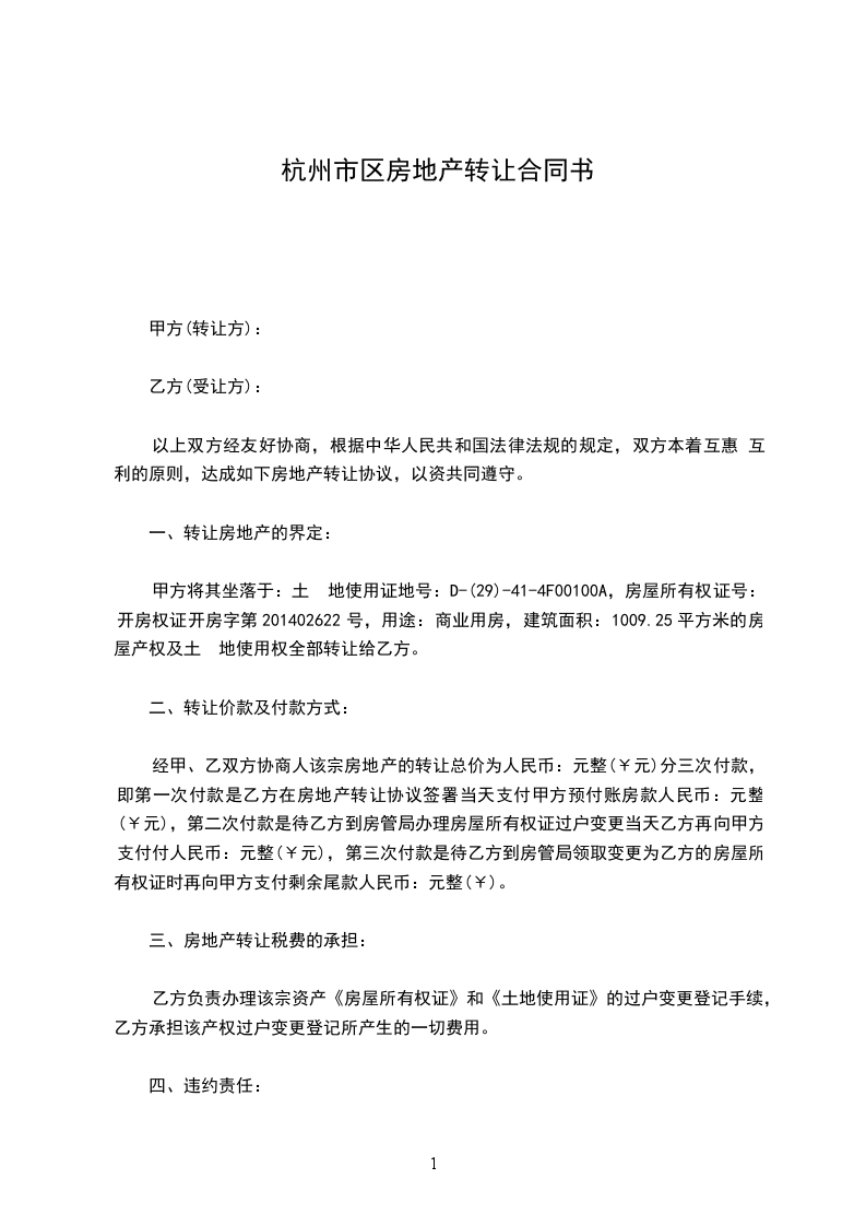 五、乙方必须于本合同签完后__________日内各甲方支付__________万元房地产转让款余款__________万元在以后的房地产转让合同中再行约定。