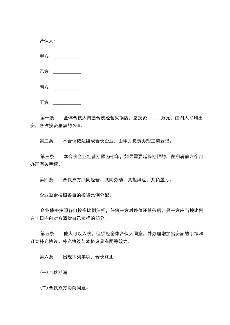 第一条 全体合伙人自愿合伙经营火锅店,总投资______万元,由四人平均出资,各占投资总额的25%。