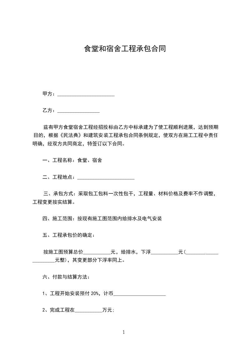 兹有甲方食堂宿舍工程经招投标由乙方中标承建为了使工程顺利进展,达到预期目的,根据《民法典》和建筑安装工程承包合同条例规定,使双方在施工工程中责任明确,经双方共同商定,特签订以下合同。
