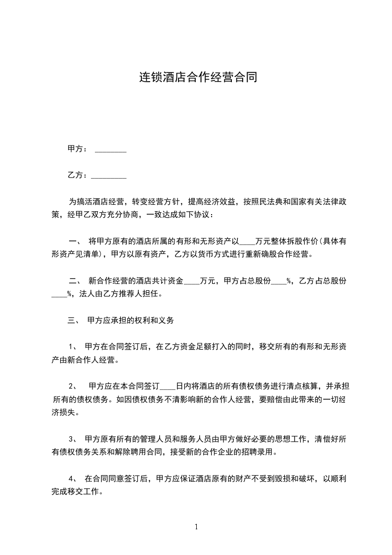二、 新合作经营的酒店共计资金____万元,甲方占总股份____%,乙方占总股份____%,法人由乙方推荐人担任。