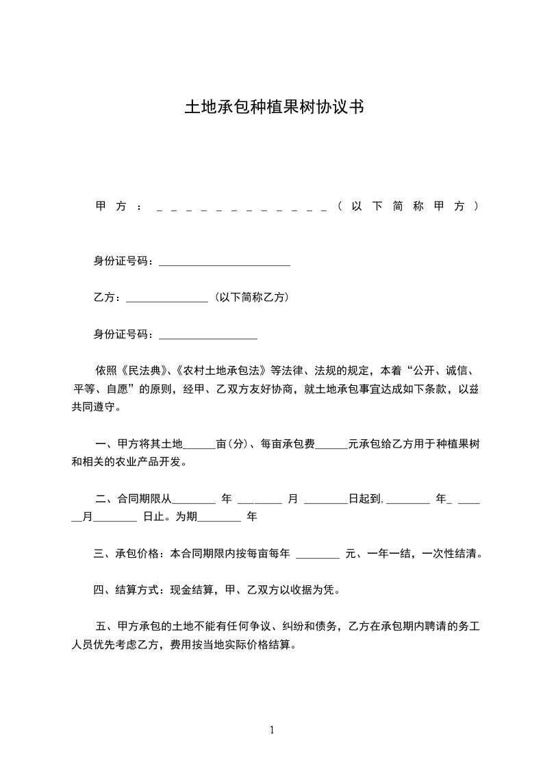 一、甲方将其土地______亩(分)、每亩承包费______元承包给乙方用于种植果树和相关的农业产品开发。