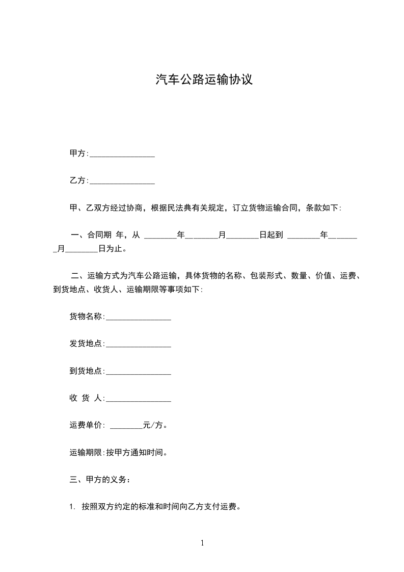 二、运输方式为汽车公路运输,具体货物的名称、包装形式、数量、价值、运费、到货地点、收货人、运输期限等事项如下: