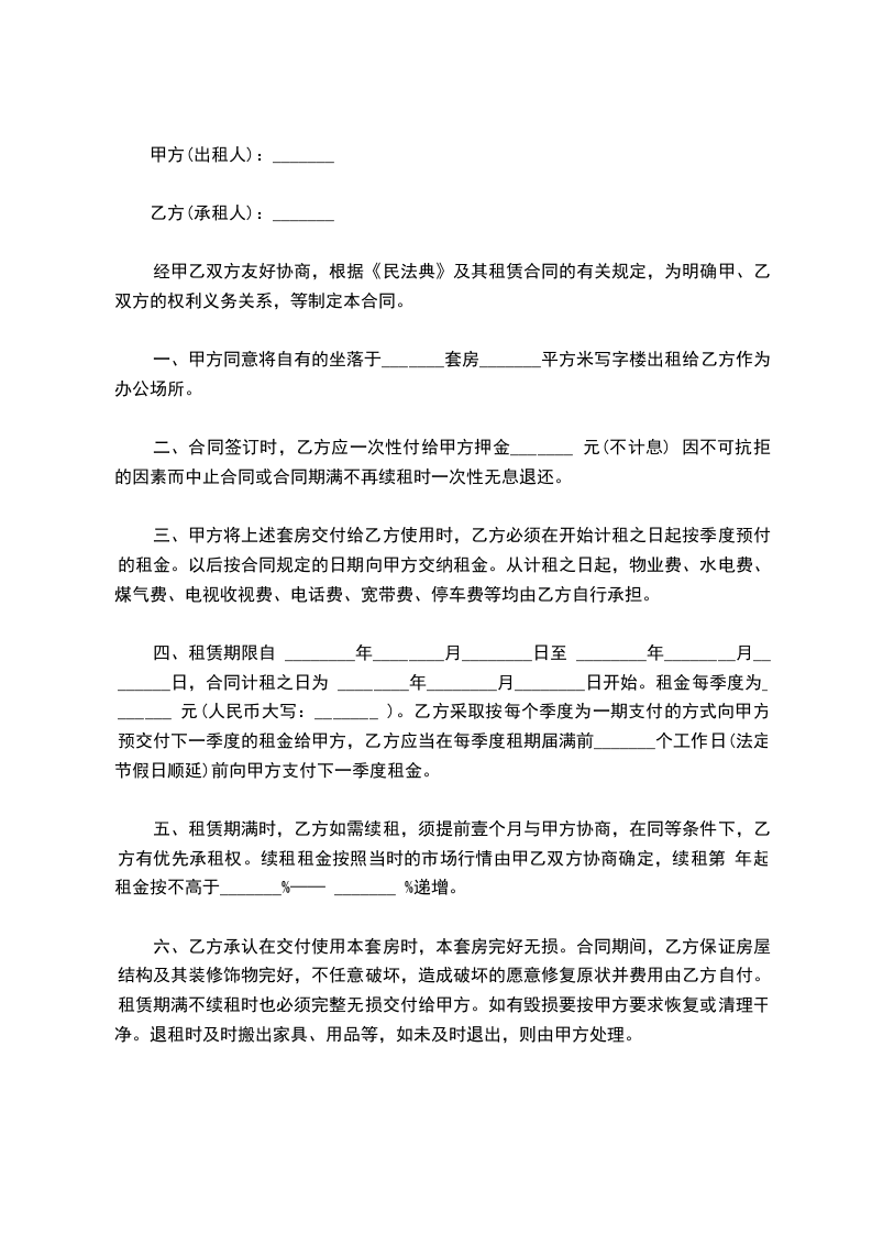 一、甲方同意将自有的坐落于_______套房_______平方米写字楼出租给乙方作为办公场所。