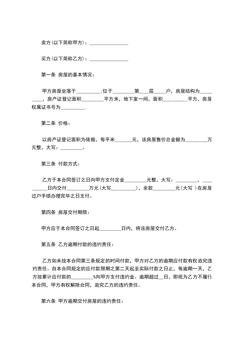 甲方房屋坐落于__________;位于_________第____层_____户,房屋结构为_________,房产证登记面积_________平方米,地下室一间,面积__________平方,房屋权属证书号为__________.