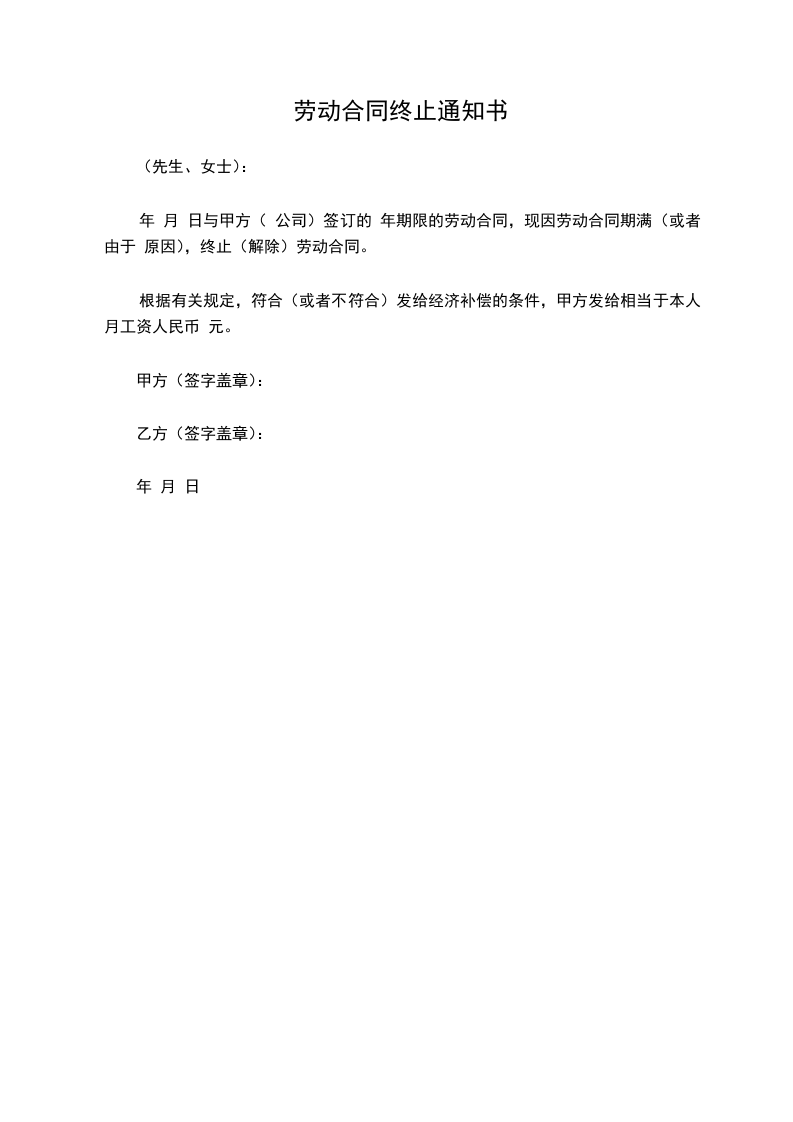 年 月 日与甲方( 公司)签订的 年期限的劳动合同,现因劳动合同期满(或者由于 原因),终止(解除)劳动合同。