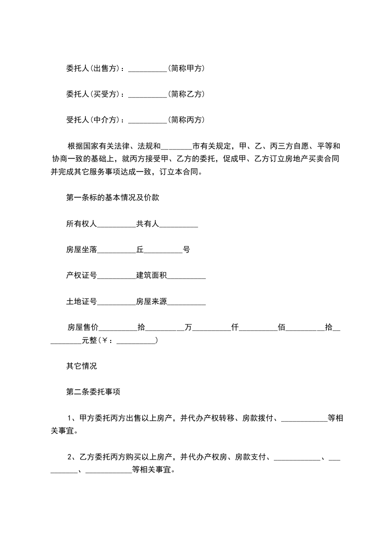1、甲方委托丙方出售以上房产,并代办产权转移、房款拨付、____________等相关事宜。
