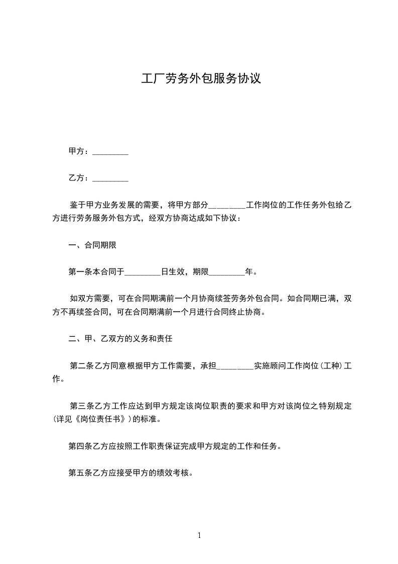 鉴于甲方业务发展的需要,将甲方部分_________工作岗位的工作任务外包给乙方进行劳务服务外包方式,经双方协商达成如下协议: