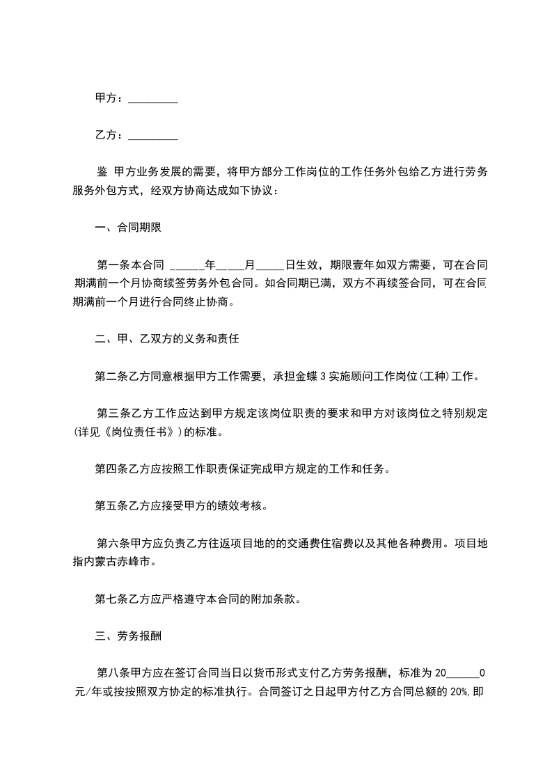 第八条甲方应在签订合同当日以货币形式支付乙方劳务报酬,标准为_________元/年或按按照双方协定的标准执行。