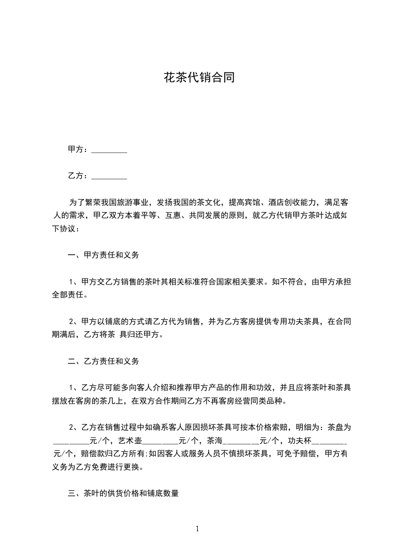 为了繁荣我国旅游事业,发扬我国的茶文化,提高宾馆、酒店创收能力,满足客人的需求,甲乙双方本着平等、互惠、共同发展的原则,就乙方代销甲方茶叶达成如下协议: