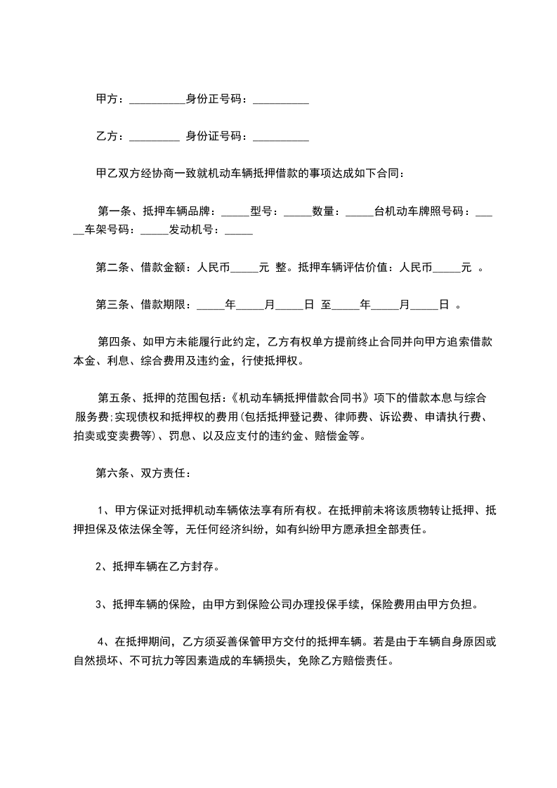 第一条、抵押车辆品牌:_____型号:_____数量:_____台机动车牌照号码:_____车架号码:_____发动机号:_____